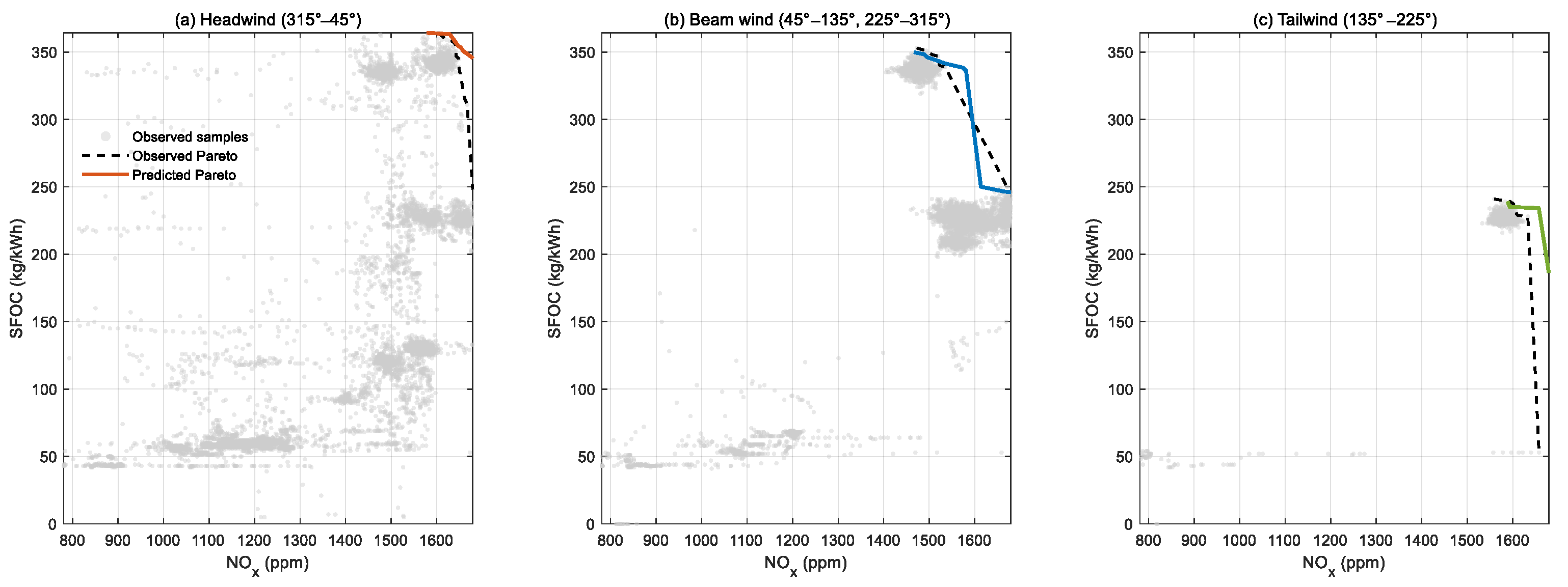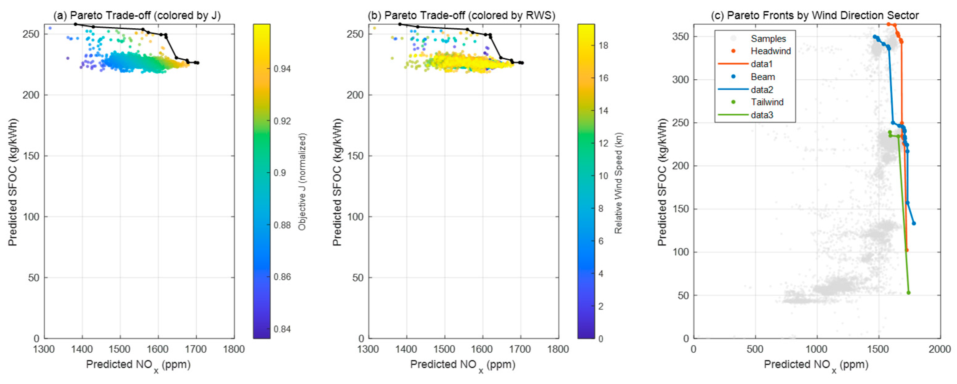 Analysis of the relative wind distributions revealed that headwind and beam wind conditions accounted for about 70% of the voyage data. Under headwinds, the engine load increased by approximately 12% and the SFOC rose by 8.4 g/kWh. Under tailwinds, the SFOC decreased by up to 6.7 g/kWh at the same shaft power. In terms of pollutant emissions, the average NOx concentration was about 845 ppm under headwinds while only 712 ppm under beam winds and 655 ppm under tailwinds. A nonlinear threshold effect was observed where the RWS exceeded 12 kn with NOx emissions surpassing 1500 ppm under combined high-load and high-wind conditions. Regression modeling showed that, while MLR failed to capture nonlinear effects, GAM successfully reflected local threshold behavior to achieve a high explanatory power (R2 = 0.98). This underscores the necessity of nonlinear models to interpret wind–load interactions and their effects on the tradeoff between propulsion efficiency and pollutant emissions. Optimization analysis identified distinct Pareto fronts across wind sectors. Under headwinds, reducing NOx emissions required a substantial sacrifice of propulsion efficiency. In contrast, beam wind and tailwind conditions allowed simultaneous improvement of both the NOx emissions and propulsion efficiency. An optimal operational window was identified for beam winds and tailwinds at a moderate RWS of 6–10 kn and engine load of 30–40%.