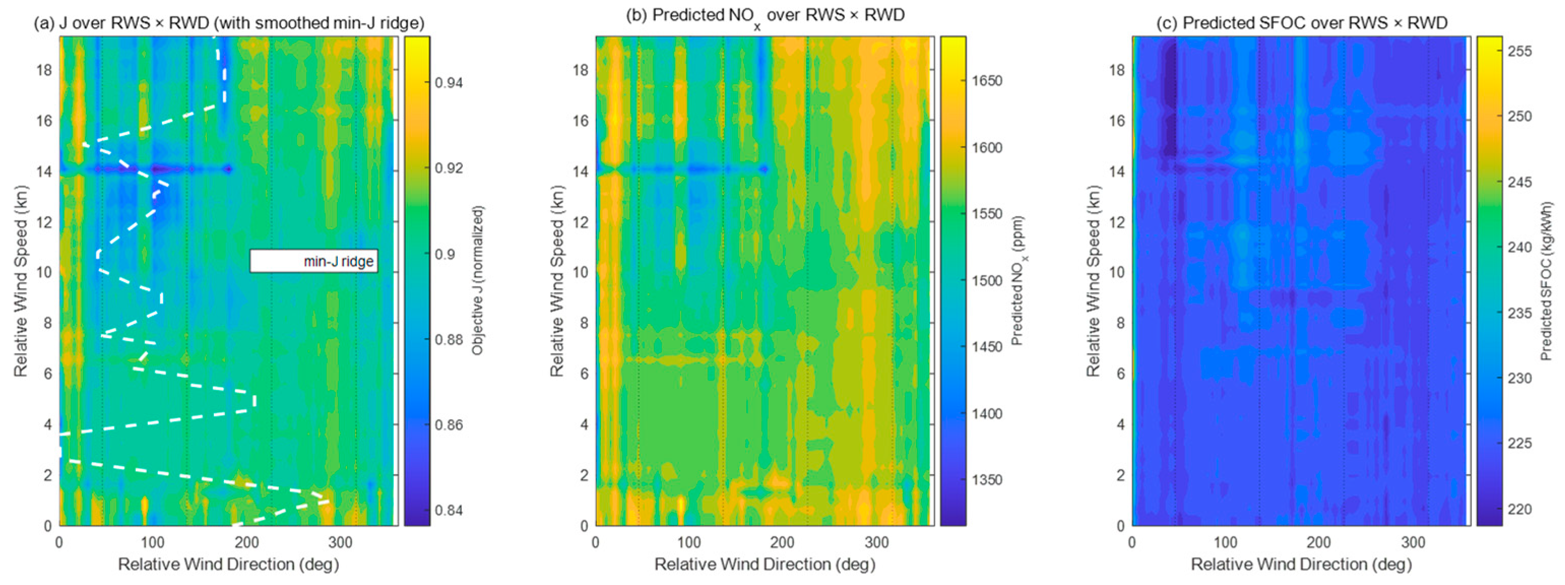 Figure 12. RWD–RWS maps: (a) normalized objective function J with identified min-J ridge, (b) predicted NOx emissions, and (c) predicted SFOC. The dark ridge of minimum J (white dotted line) represents the optimal operating window (6–10 kn RWS, 120–210° RWD, 30–40% engine load), and the dotted line in (a) indicates the boundary of the low-J region predicted by the model.