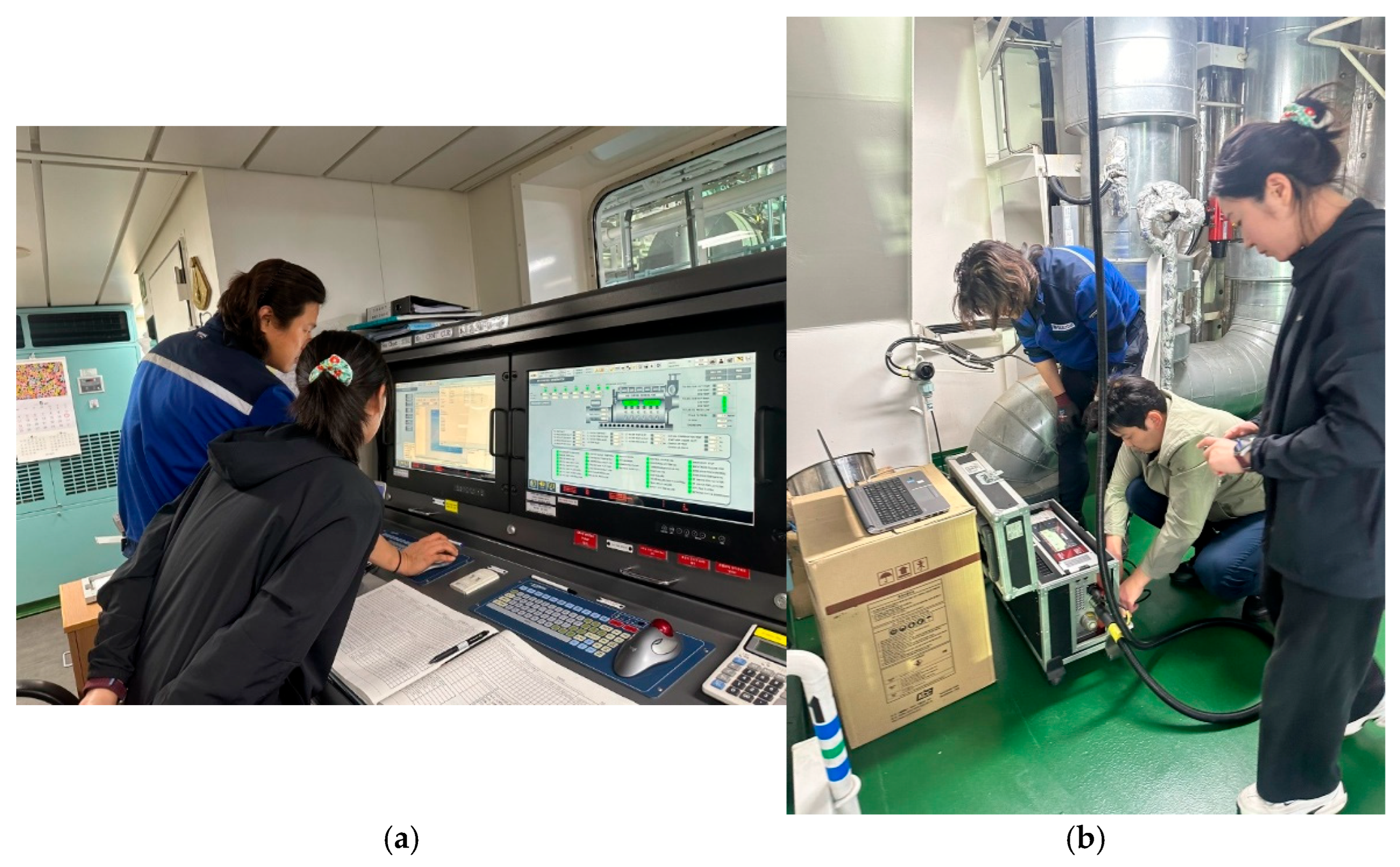 Table 1 summarizes the specifications of Baekkyung, which is a training ship operated by Pukyong National University, Republic of Korea. Training ships are advantageous as a research platform because they can be operated at different headings and speeds without the economic constraints of cargo operations [14,16]. This operational flexibility allows controlled exposure to different wind conditions and supports comprehensive performance testing. The training ship is powered by a single two-stroke and low-speed diesel engine that is directly coupled to a four-blade controllable pitch propeller (CPP) for precise thrust control, which is necessary to study propulsion–environment interactions under varying engine loads [19]. Four ballast voyages were conducted in the Korea Strait between 29 April, and 2 May 2025, which is a period characterized by spring monsoon activity and diverse wind conditions [20]. Each voyage comprised headwind, beam wind, and tailwind legs. The engine load, CPP pitch, and speed over ground (SOG) were intentionally varied to capture propulsion–environment interactions while minimizing displacement effects.