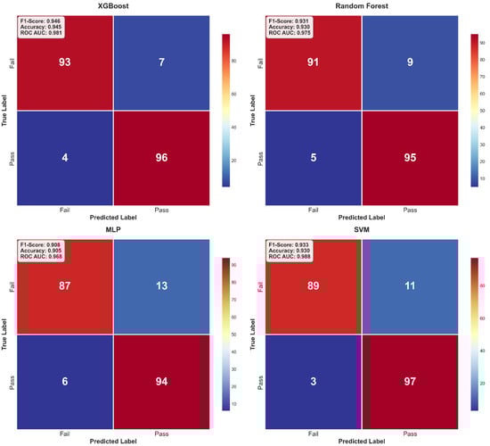 Shin and Yang [] reported similar advantages in maritime accident prediction using small-scale datasets, further supporting their robustness across different maritime applications. The choice between models involves strategic trade-offs. XGBoost’s higher F1-score suggests better classification accuracy for binary pass/fail decisions, making it suitable for automated screening. SVM’s superior ROC AUC indicates more reliable probability estimates, valuable for ranking candidates or setting flexible decision thresholds based on recruitment quotas. Random Forest (F1-score: 0.931, ROC AUC: 0.975) represents a robust alternative, while MLP’s lower performance (F1-score: 0.908) suggests limited suitability despite its theoretical capacity for complex pattern recognition.