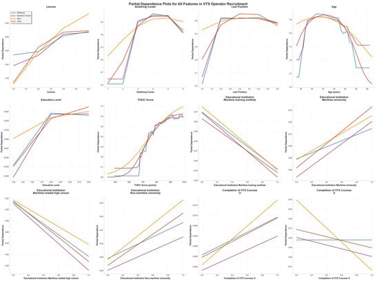 For VTS course completion, completing VTS courses (O) showed upward patterns across all models, while not completing them (X) displayed downward patterns. The specific implications of these partial dependence patterns for VTSO recruitment and their interpretation within the practical context of the maritime industry will be discussed in detail in the following section.