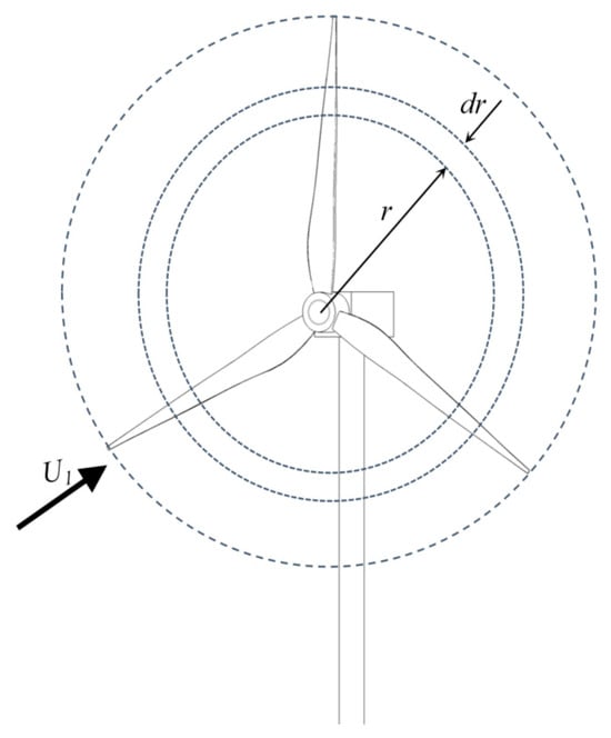 The aerodynamic loads, comprising lift and drag forces, are computed using blade element momentum theory (BEM) []. This model divides the blade radially into 2D airfoil elements, determining forces based on local velocity and angle of attack while neglecting radial and three-dimensional effects. While this BEM model, which relies on 2D airfoil data and assumes rigid blades, cannot capture complex aeroelastic effects, its fidelity is sufficient for this study’s core scope of validating overall platform survivability and stability. The resulting BEM-derived aerodynamic forces are then applied back to the platform, ensuring a physically consistent interaction between the environmental loads and the structure’s dynamic response. Figure 4 illustrates the schematic configuration of a blade element and its corresponding annular ring.