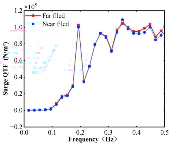 In ANSYS-AQWA, mesh validation follows both near-field and far-field methodologies []. The near-field approach computes the second-order steady drift force via direct integration of the pressure time series over the mesh, a process highly sensitive to local element quality. In contrast, the far-field method derives the same force from a control volume balance of fluid momentum, offering robustness to coarser meshes and reduced computational cost. As shown in Figure 5, both techniques converge to essentially identical steady drift force predictions, thereby verifying that the current mesh resolution meets the engineering accuracy requirements for deep-water floating wind applications.