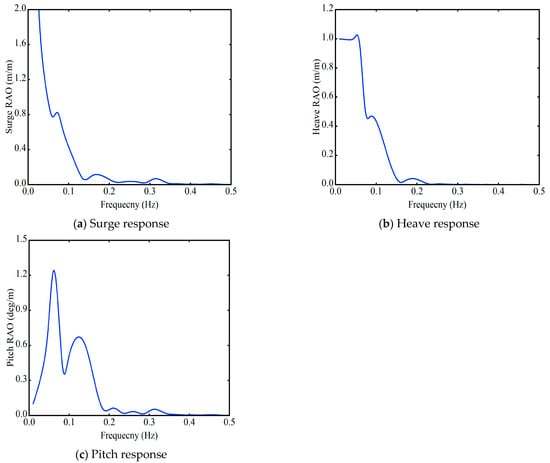 The frequency-domain RAOs for surge, heave, and pitch are presented in Figure 7. As depicted, the surge RAO exhibits a decreasing trend with increasing wave frequency, whereas the heave and pitch RAOs display a distinct resonant behavior. The heave RAO reaches its peak at a wave frequency of approximately 0.056 Hz, while the pitch RAO peaks at around 0.059 Hz. The results indicate that the platform’s overall response is dominated by surge motion. The relatively small responses in heave and pitch suggest good platform stability in these degrees of freedom. Furthermore, a strong coupling between the surge and pitch motions is evident from the results. As linear potential-flow results, these RAOs cannot capture non-linearities. Moreover, they neglect viscous damping, which would significantly ‘flatten’ the resonant peaks in Figure 7 and govern the true amplitude. Thus, while RAOs confirm conceptual stability, a non-linear time-domain analysis is essential for assessing survival performance and accurately quantifying fatigue.
