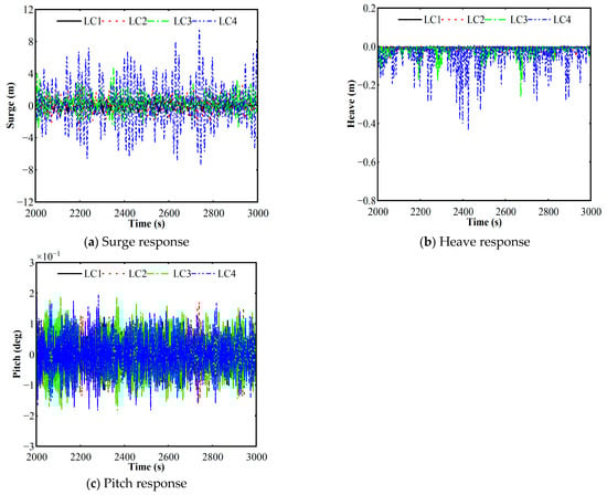 For pitch motion (Figure 8c), the most critical finding is the exceptionally small magnitude of the pitch motion across all conditions, a direct result of the platform’s highly stable design. This is a direct result of the platform’s highly stable design, where the maximum pitch angle is only approximately ±0.2 degrees, even in the most severe sea state (LC4). The motion is characterized by high-frequency oscillations around a zero-mean angle, consistent with a direct response to wave excitation. These results powerfully validate the superior rotational stability of the proposed hexagonal TLP design.