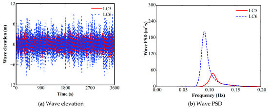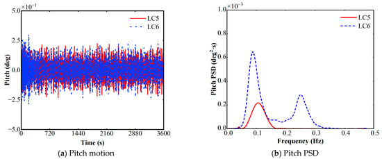 To capture the fully coupled wind–wave–current dynamics, two additional combined load cases (LC5 and LC6) were defined by superimposing uniform current loading and rated-wind-speed aerodynamic forcing onto the baseline JONSWAP wave excitation. Figure 9 presents the significant wave height time series and associated power spectra densities (PSD) for LC5 and LC6. The platform’s dynamic responses in surge, heave, and pitch, presented in both the time domain and through their corresponding PSD plots, are respectively shown in Figure 10, Figure 11 and Figure 12. The spectral analysis clearly indicates that for all three degrees of freedom, the response energy is dominated by a pronounced peak at the primary wave frequency (approximately 0.09 Hz). This confirms that the platform’s behavior is primarily governed by first-order wave-frequency (WF) excitations.