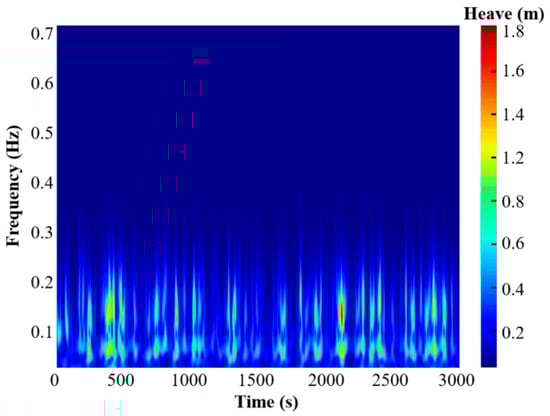 To further elucidate the platform’s time-localized response characteristics, we performed continuous wavelet transform (CWT) analysis on the heave time series, a localized time-frequency method capable of resolving short-duration, high-energy oscillatory components. Figure 13 presents the CWT of the TLP’s heave response over the 3600-s simulation, providing a time-frequency localization of the signal’s energy. The resulting scalogram is dominated by a persistent, high-energy band centered in the primary WF range of approximately 0.05–0.12 Hz. This band represents the platform’s continuous first-order response to the incident wave field. Superimposed upon this WF response are several intermittent, localized energy bursts, most notably around t = 600 s and t = 2600 s. These events, which coincide with the passage of energetic wave groups, reveal the transient nature of the heave dynamics. They reflect moments of intensified, nonlinear wave-structure interaction and the excitation of higher-order harmonic content that are averaged out in a conventional spectral analysis. In contrast, calmer periods, such as the interval between 1000 s and 1500 s, are characterized by a significantly lower overall spectral intensity, demonstrating the rapid decay of heave oscillations as extreme forcing subsides.