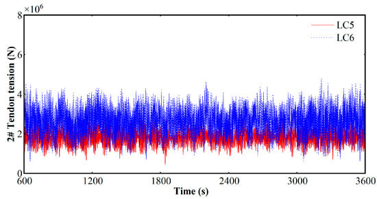 Figure 14, Figure 15, and Figure 16 respectively present the tension time histories for tendons T1, T2, and T6 under the LC5 and LC6 return period load cases, with the initial 600 s of transient response removed from the analysis. A comparative analysis among the tendons reveals that T1, as the primary upwind tendon, consistently experiences the highest mean tension and the largest dynamic oscillation amplitudes. This highlights T1′s governing role in counteracting the combined environmental forces.