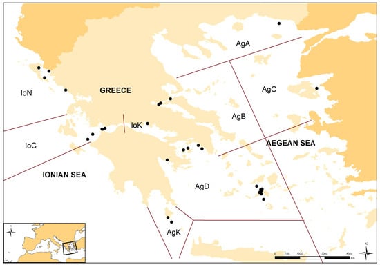 Map of the sampling stations (black dots) from which the sponge samples were caught during bottom trawl surveys. Bottom left corner: the location of the study area (Aegean and Ionian Seas) in the Mediterranean Sea. AgA—North Aegean; AgB—Central–West Aegean; AgC—Central–East Aegean; AgD—South–West Aegean; AgK—the marine area around Kythira Isl.; IoN—North Ionian; IoC—Central Ionian; IoK—the Korinthiakos gulf.