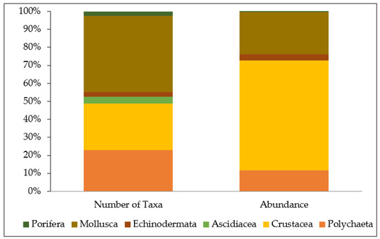 Mollusks represented the most taxa-rich group (Figure 3), accounting for 42.3% of the total taxa found (33 taxa), followed by crustaceans (25.6%, 20 taxa) and polychaetes (23.1%, 18 taxa). Ascidians accounted for 3.8% (3 taxa), while echinoderms and sponges contributed 2.6% (2 taxa) each to the total taxa pool (Figure 3).