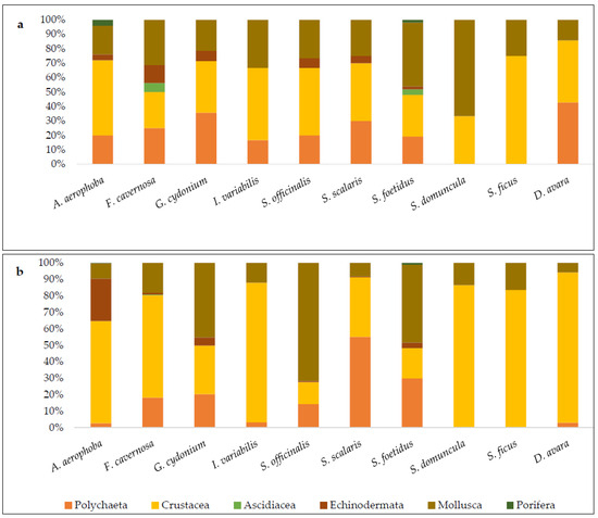 The structure of the associated communities varied across sponge species, particularly in terms of taxa richness within higher taxonomic groups (Figure 4a). Crustaceans and mollusks alternated as the most taxa-rich group among host sponges. Crustaceans exhibited the highest number of taxa in Aplysina aerophoba (52%), Ircinia variabilis (50%), Spongia (Spongia) officinalis (46.7%), Scalarispongia scalaris (40%), and Suberites ficus (75%), while mollusks dominated in Fasciospongia cavernosa (31.3%), Sarcotragus foetidus (46%), and Suberites domuncula (66.6%). In Dysidea avara and Geodia cydonium, crustaceans and polychaetes co-dominated, each representing 42.9% and 35.7%, respectively.