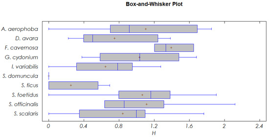 Shannon diversity index (H’) values of the associated communities for each sponge species. Cross (+) denotes the median value.