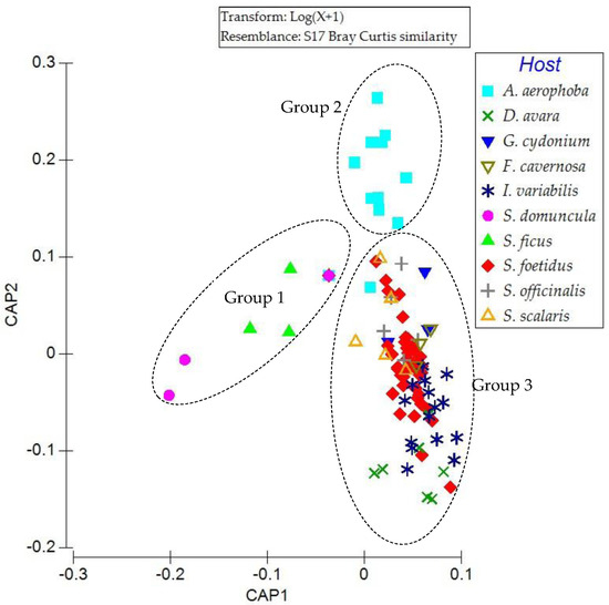 Canonical Analysis of Principal Coordinates (CAP) plot for the associated communities of each sponge species (host), based on abundance data.
