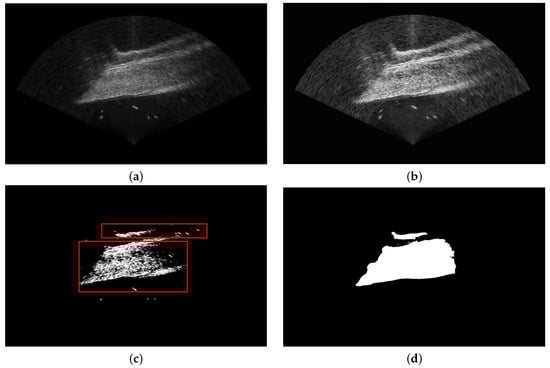 SAM is an interactive segmentation model that takes both an image and corresponding prompts, such as bounding boxes or points, as input. The prompts specify the location and scope of the targets. An preprocessing pipeline is designed to produce accurate candidate boxes as prompt for the SAM network. First, the input image I is enhanced using CLAHE(Contrast Limited Adaptive Histogram Equalization) [], and then binarized using a grayscale threshold filter. Pixels with intensities greater than a given threshold T are retained as the initial mask. Subsequently, the minimum bounding rectangles of all connected regions in the initial mask are computed. Those areas greater than are selected as prompts . These prompts guide SAM network to generate more focused and structurally complete pseudo-labels. Figure 4a is the original sonar image, Figure 4b is the enhancement result of CLAHE, Figure 4c shows the binarized sonar image filtered by the initial mask, in which the red boxes denote the generated prompts by the above method, Figure 4d displays the pseudo-labels generated by SAM network using the corresponding prompts.