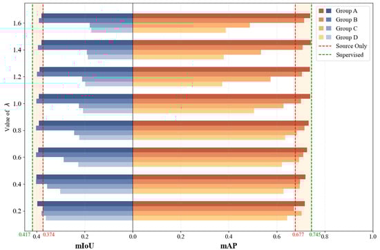 The results indicate that as increases from 0 to 1.6, the model’s mAP gradually improves. Meanwhile, mIoU first increases and then decreases with the increase of , and reaching its peak at . In addition, when , both mAP and mIoU are relatively low, suggesting that supervision from SAM pseudo-labels in the target domain can significantly enhance the model’s performance.
