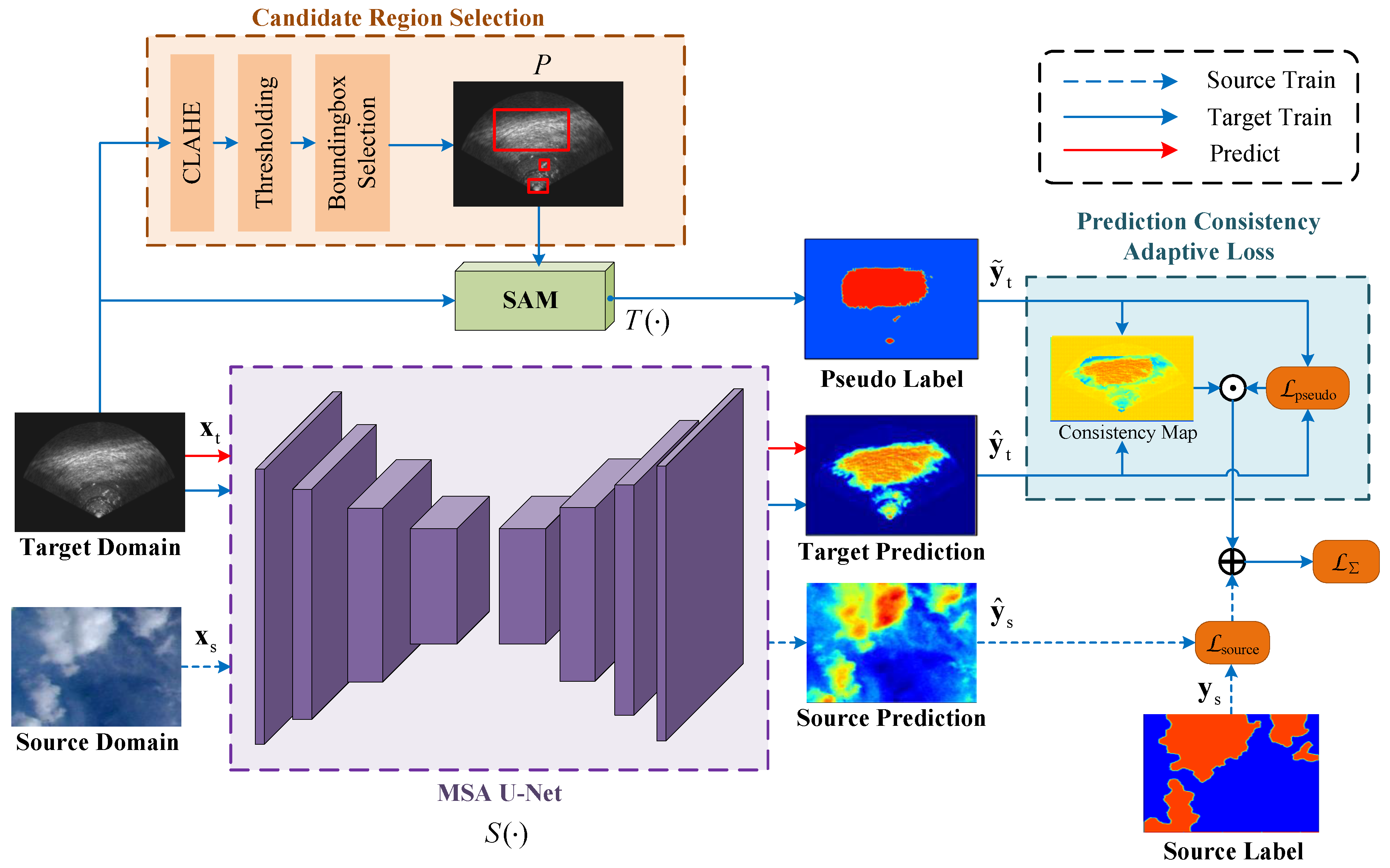 - An adaptive supervision weight adjustment method is proposed based on the consistency between pseudo-labels and student predictions. The consistency between the teacher and student predictions to each same sample in target domain is computed and represented as a pixel-wise consistency map. The guidance intensity is dynamically adjusted based on the consistency maps.
