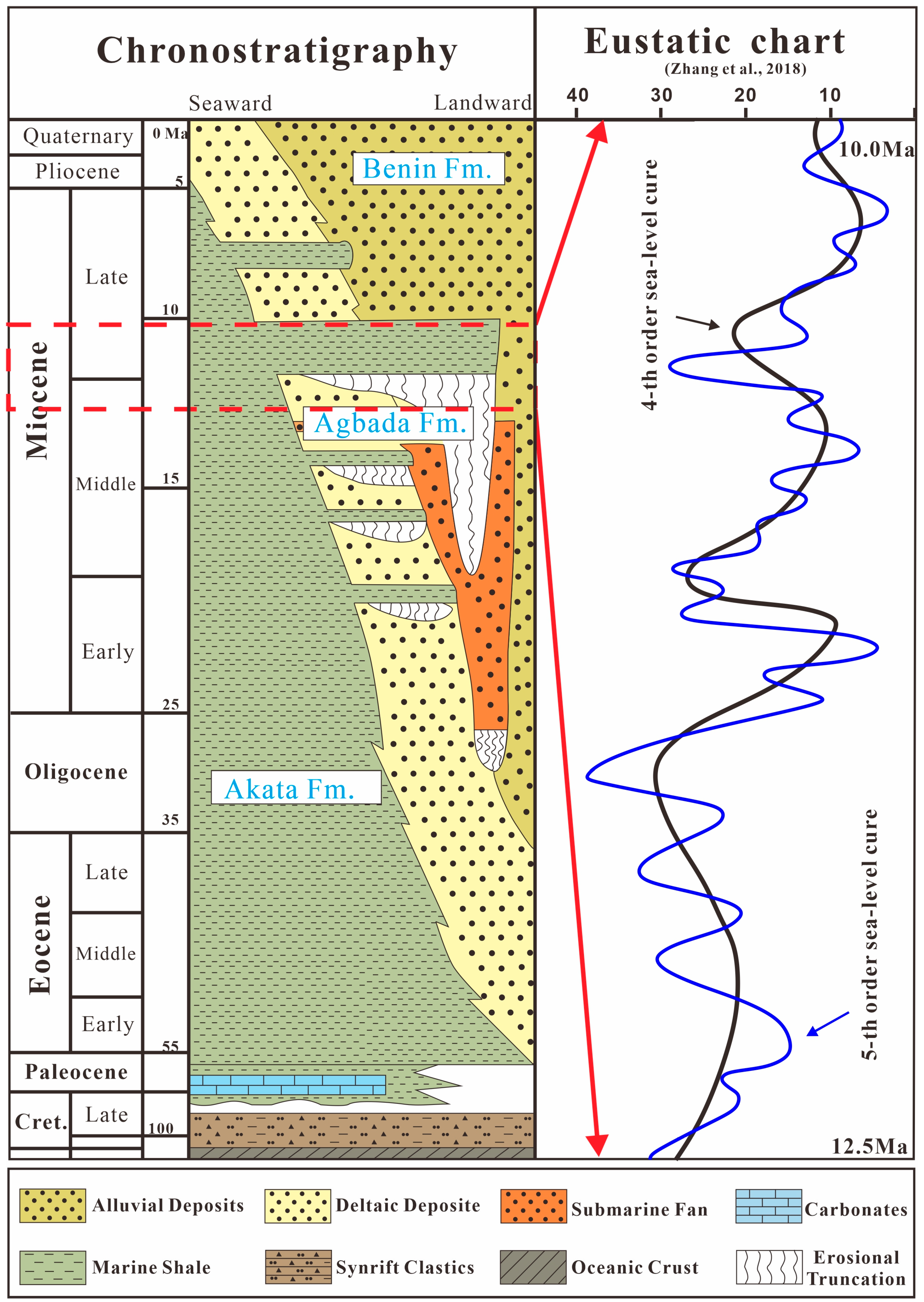 - The study area in the Niger Delta developed within a complete 4th-order sea-level cycle, which encompassed four 5th-order cycles. The ECS formed during the first two 5-order cycles, whereas the WCS developed during the latter two, corresponding to the deposition of two deltaic lobes and two channel systems. In response to 5th-order sea-level falls, each sedimentary body exhibits coarser-grained gravelly sandy deposits at its base, transitioning upward to fine-grained siltstone and mudstone as sea level rose during the subsequent 5th-order transgressive phase.