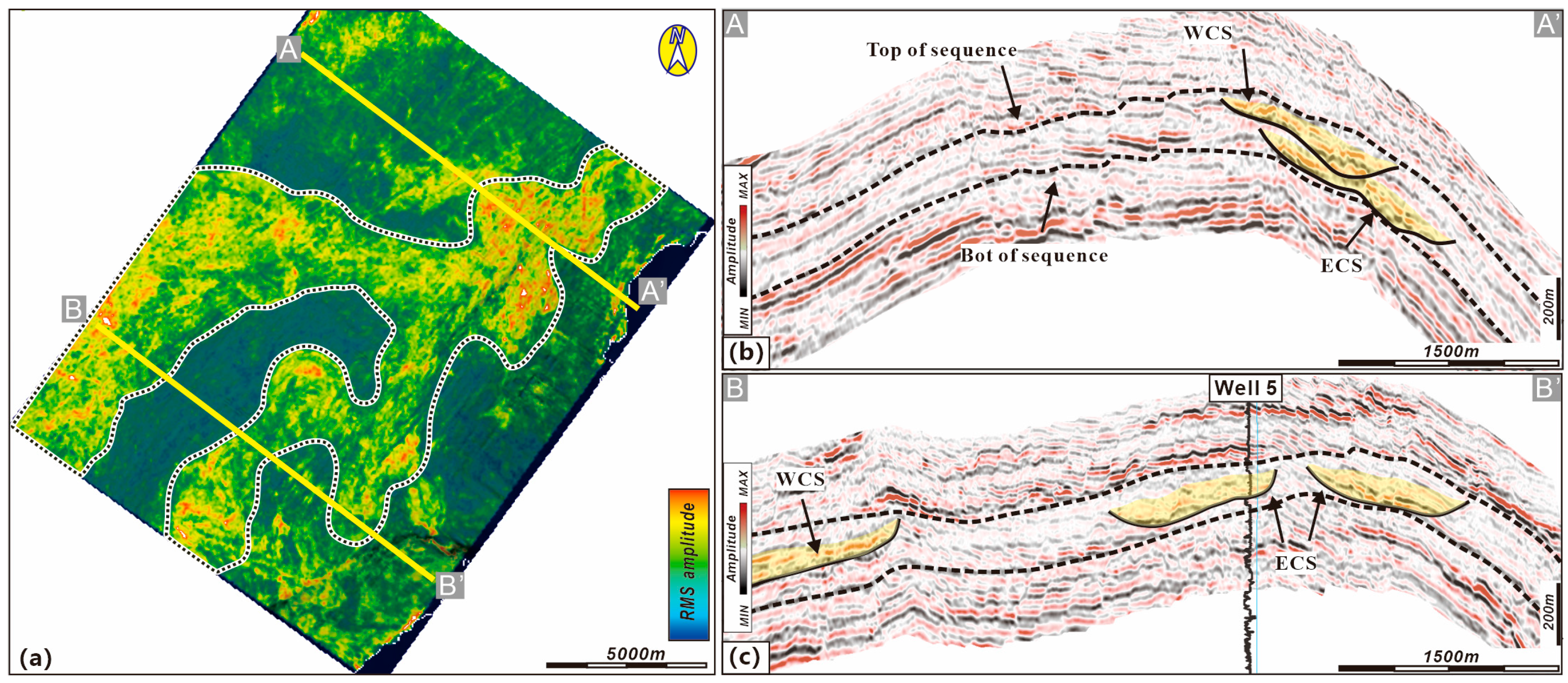 | Seismic Facies | Amplitude and Geometry Reflections | Seismic Section | RMS Attribute Map |