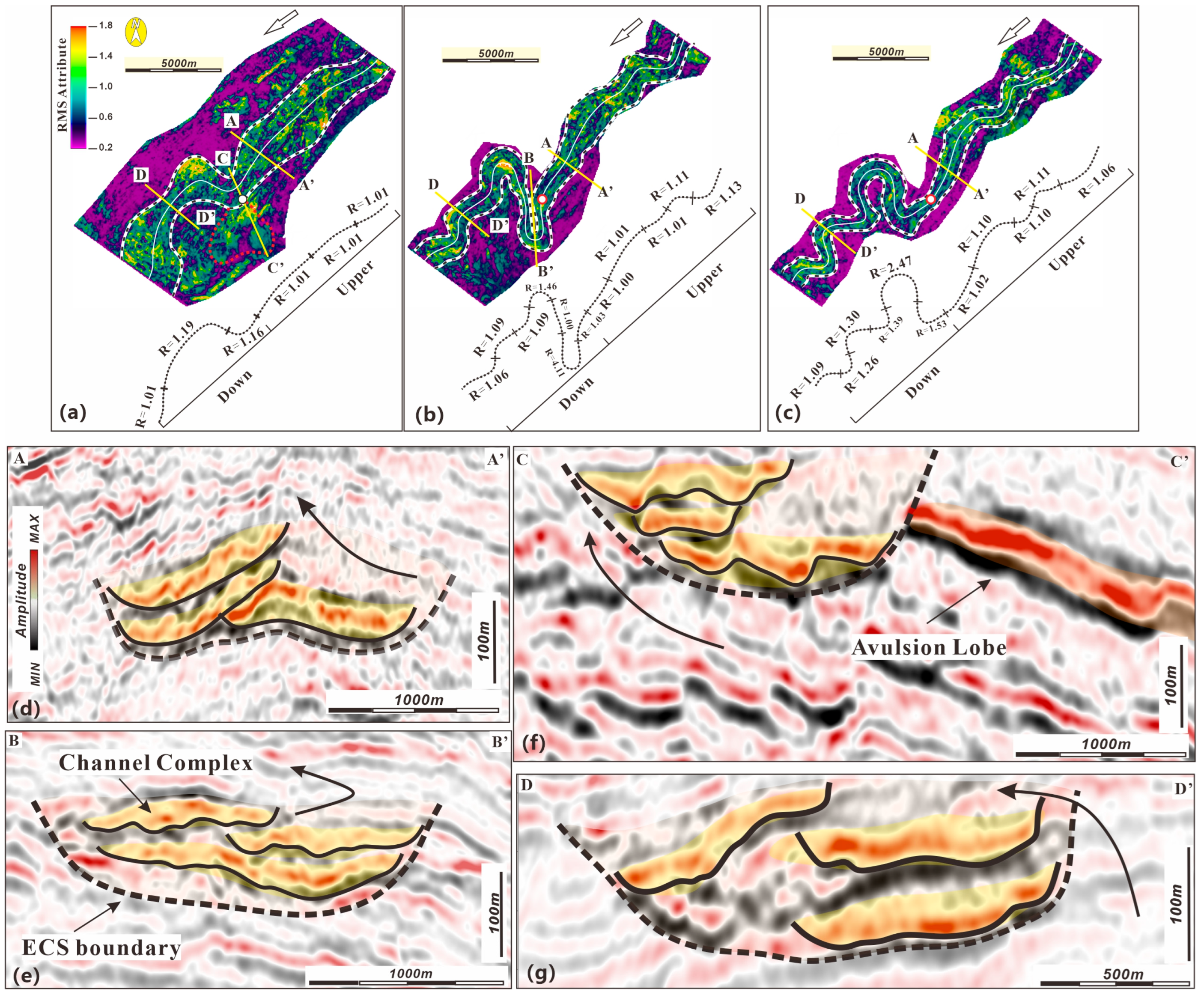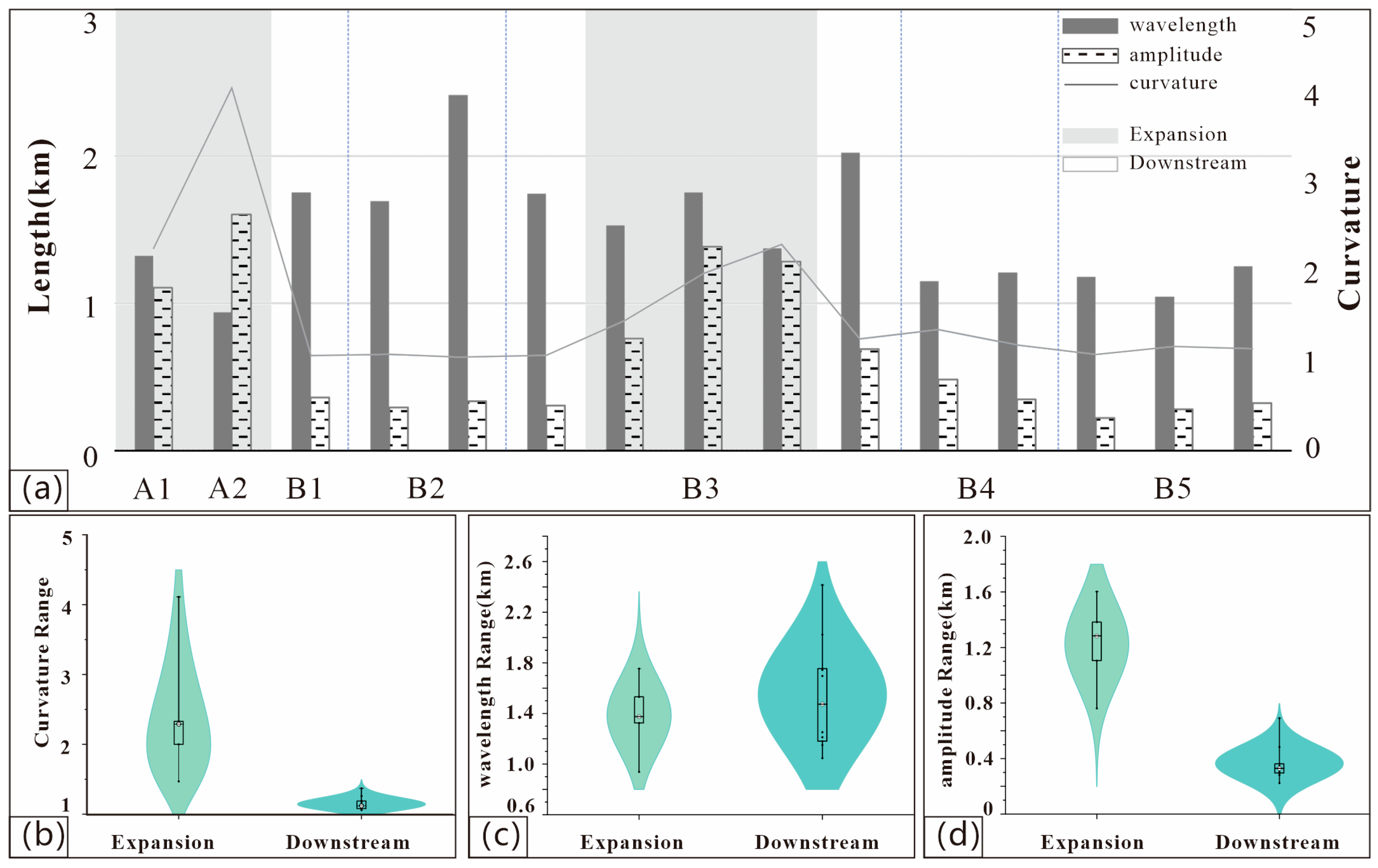 - The study area comprises a single submarine fan system developed through both channel and lobe components. Vertically, it consists of two distinct systems: the East Channel System(ECS) and the West Channel System (WCS). The lower portion of the ECS is dominated by a southward-extending lobate body, while the upper portion forms a curved channel belt. In contrast, the WCS exhibits a southwesterly lobate body in its lower section, with a more sharply curved channel belt in the upper section. In the proximal area, the two systems follow roughly parallel paths, but the WCS shifts westward in the middle section. Along the flow direction, the ECS channel belt displays a relatively gentle planar course before transitioning abruptly to a high-curvature segment. The WCS, in contrast, is more curved proximally, with its overall curvature decreasing following the mid-channel path shift.