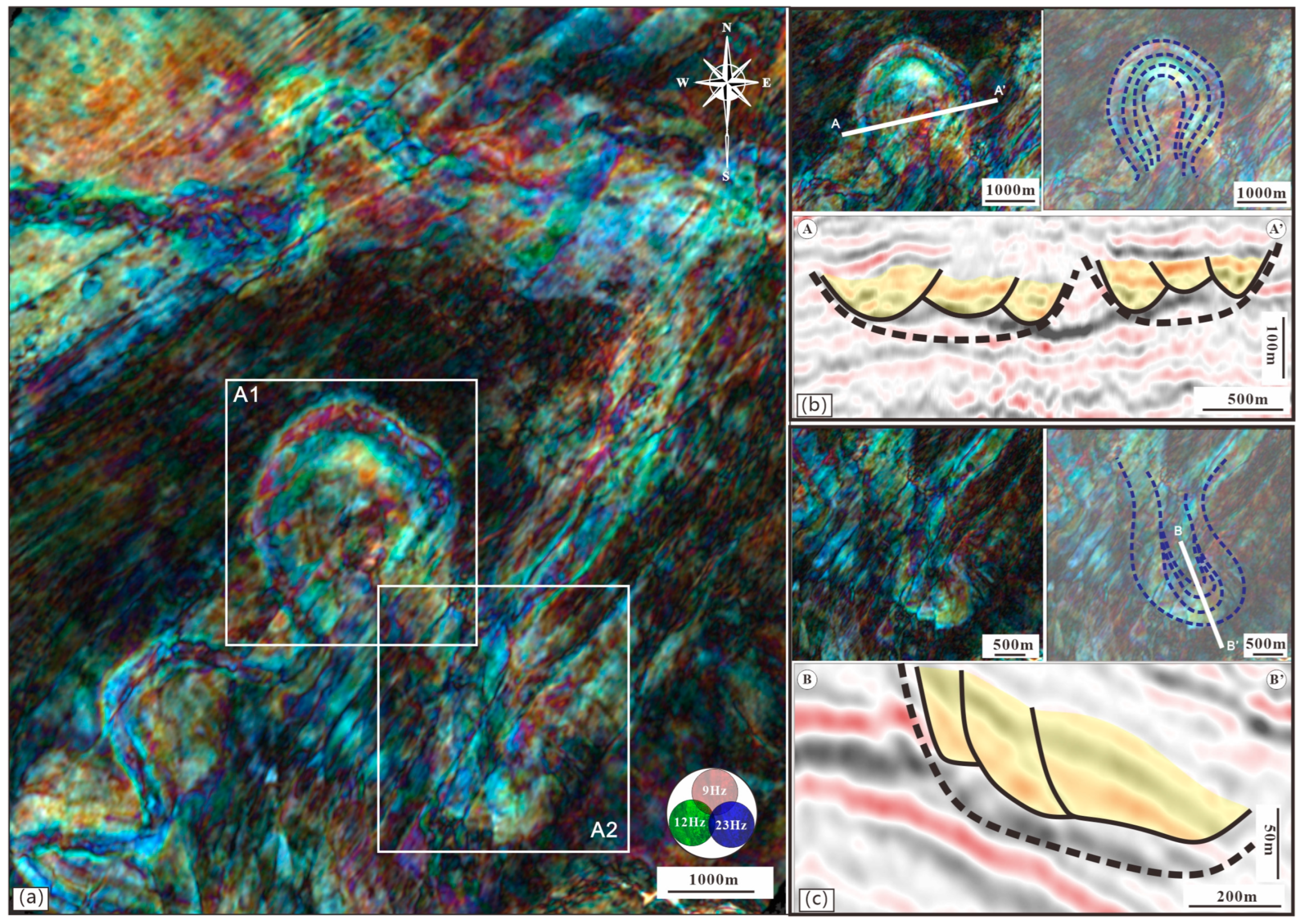 | Submarine Channel | U-shaped incised fills exhibit basal erosion surfaces truncating underlying strata, with internally discontinuous, high-amplitude subparallel reflections, indicative of cut-and-fill deposition during channel evolution | ![]() | ![]() |