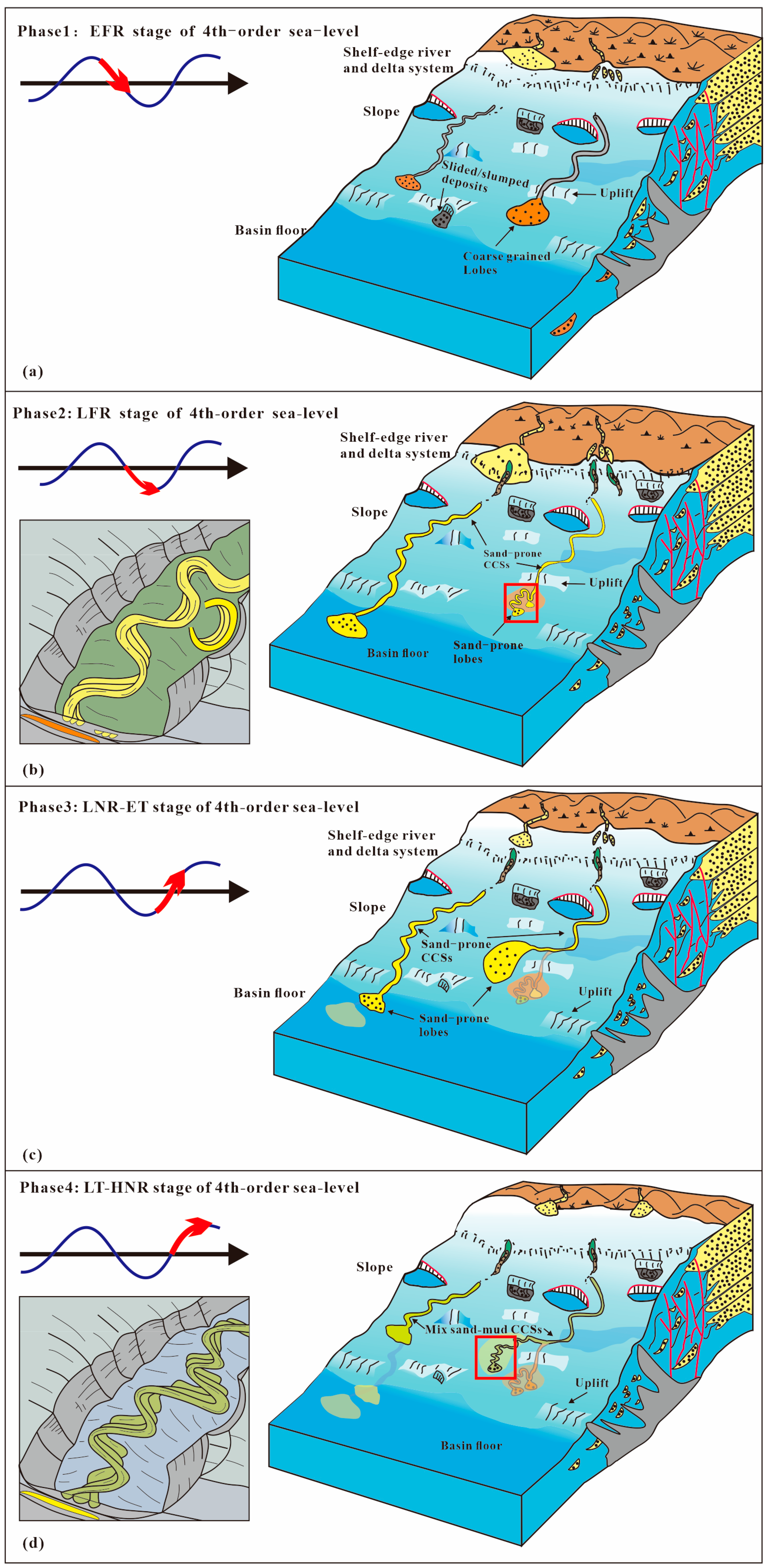 - Within this single submarine fan system, distinct channel systems display variations in planar morphology, sandstone content, migration patterns, and lithological characteristics. We interpret these differences as representing successive evolutionary stages of sediment gravity flows. In correspondence with four-stage sea-level fluctuations, the structural evolution of the submarine fan system in the study area can be divided into four phases: (1) An MTD and terminal fan dominated by debris flows and high-density turbidity currents; (2) ECS formed primarily by high-density turbidity currents, exhibiting sandy-dominated channel morphologies; (3) A terminal fan dominated by high-density turbidity currents with a predominantly sandy morphology; and (4) WCS dominated by both high- and low-density turbidity currents, featuring sand-silt-dominated deposits.