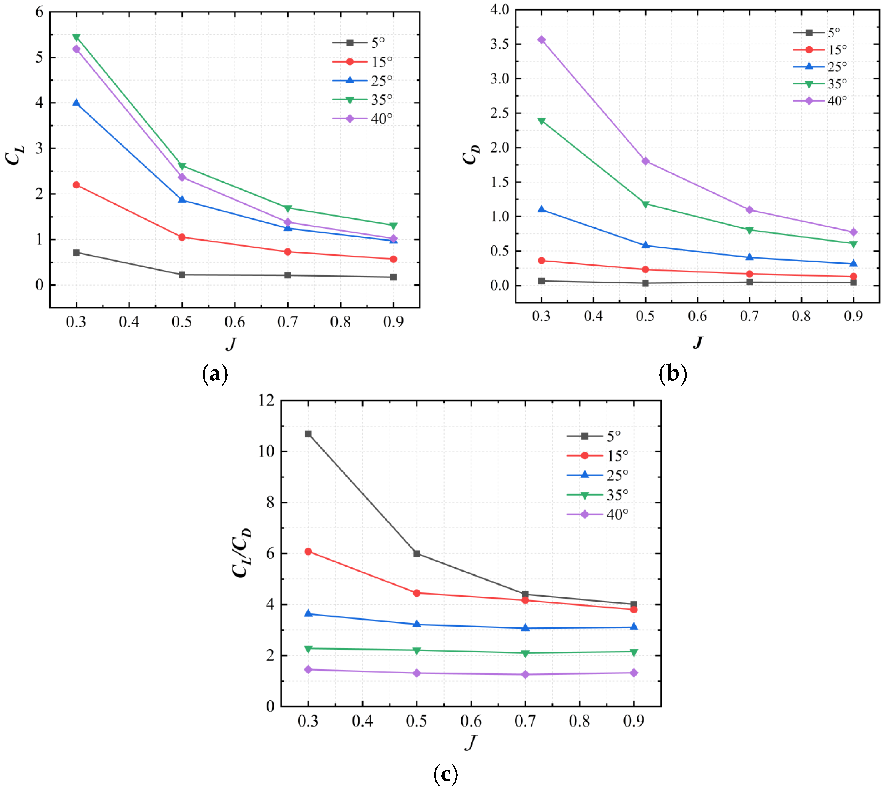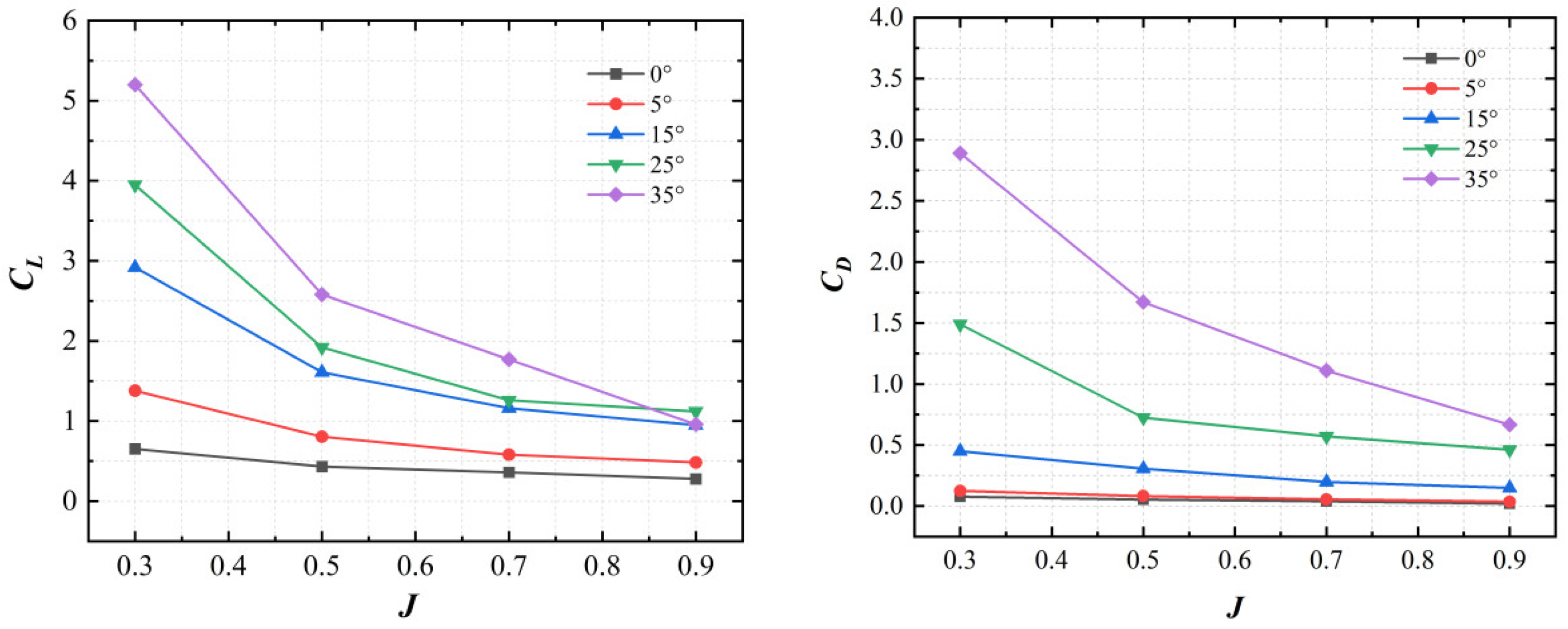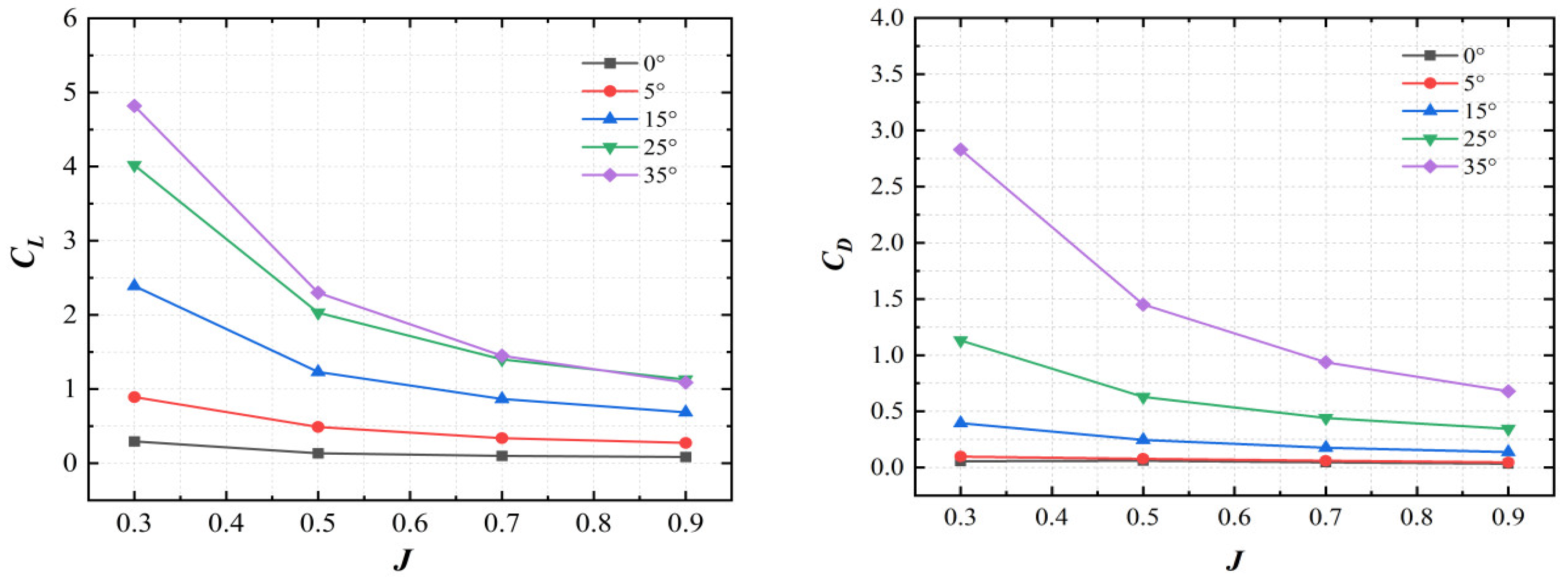 J increases; however, their lift coefficient and drag coefficient decrease with increasing