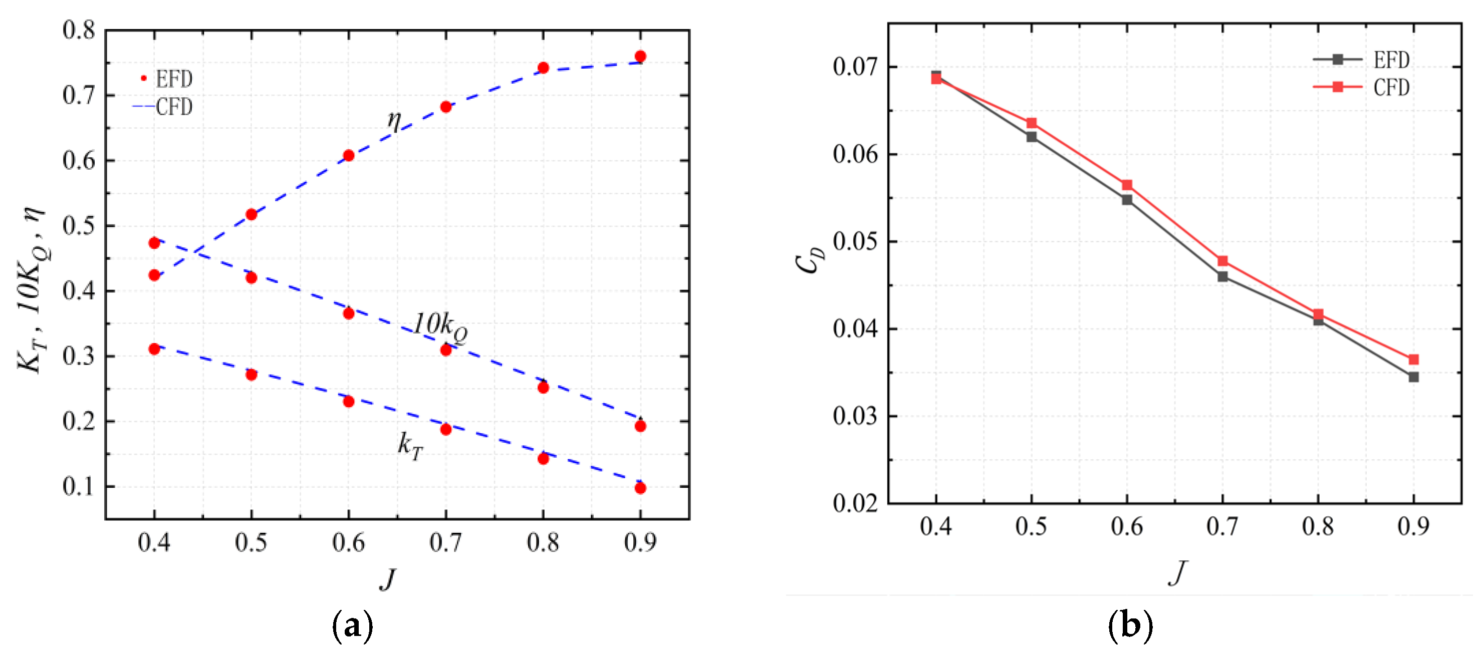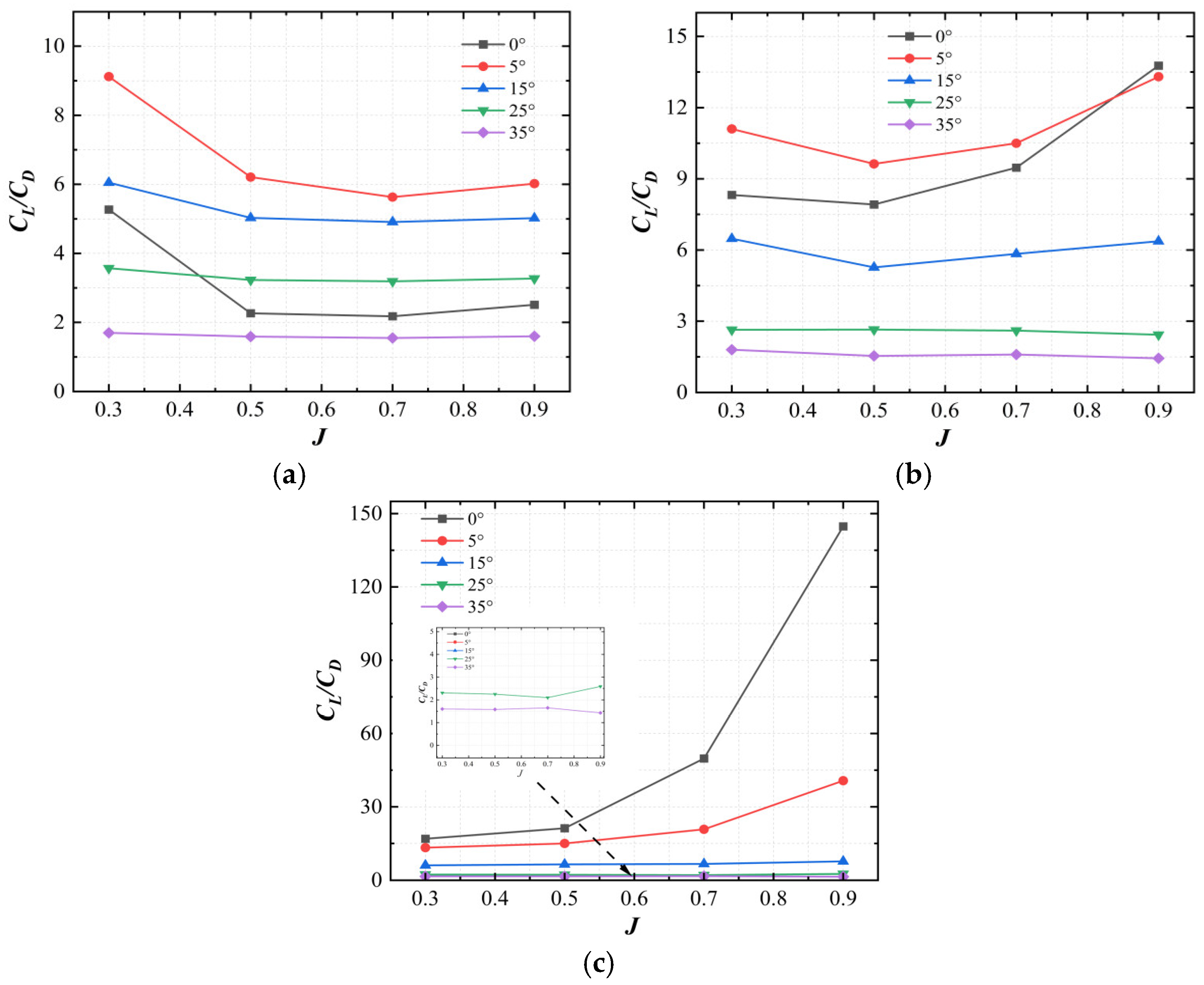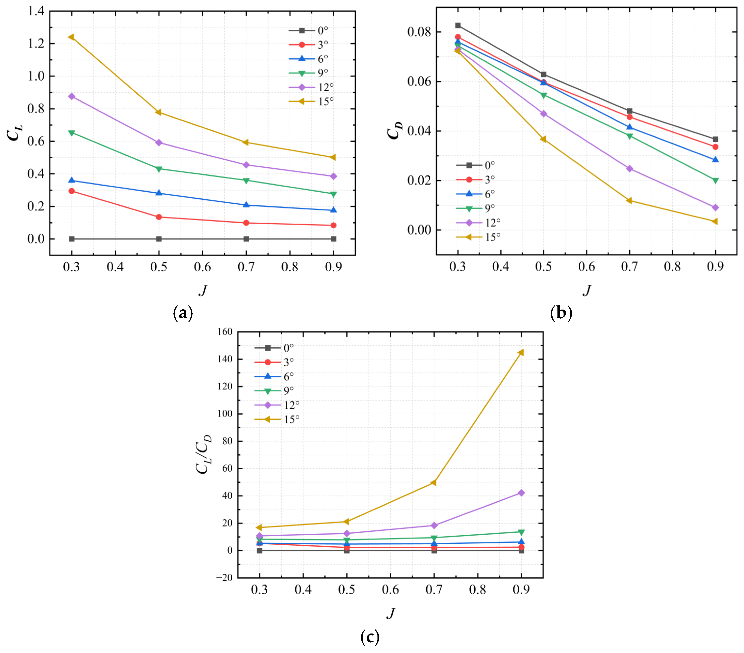 J increases; however, their lift coefficient and drag coefficient decrease with increasing
