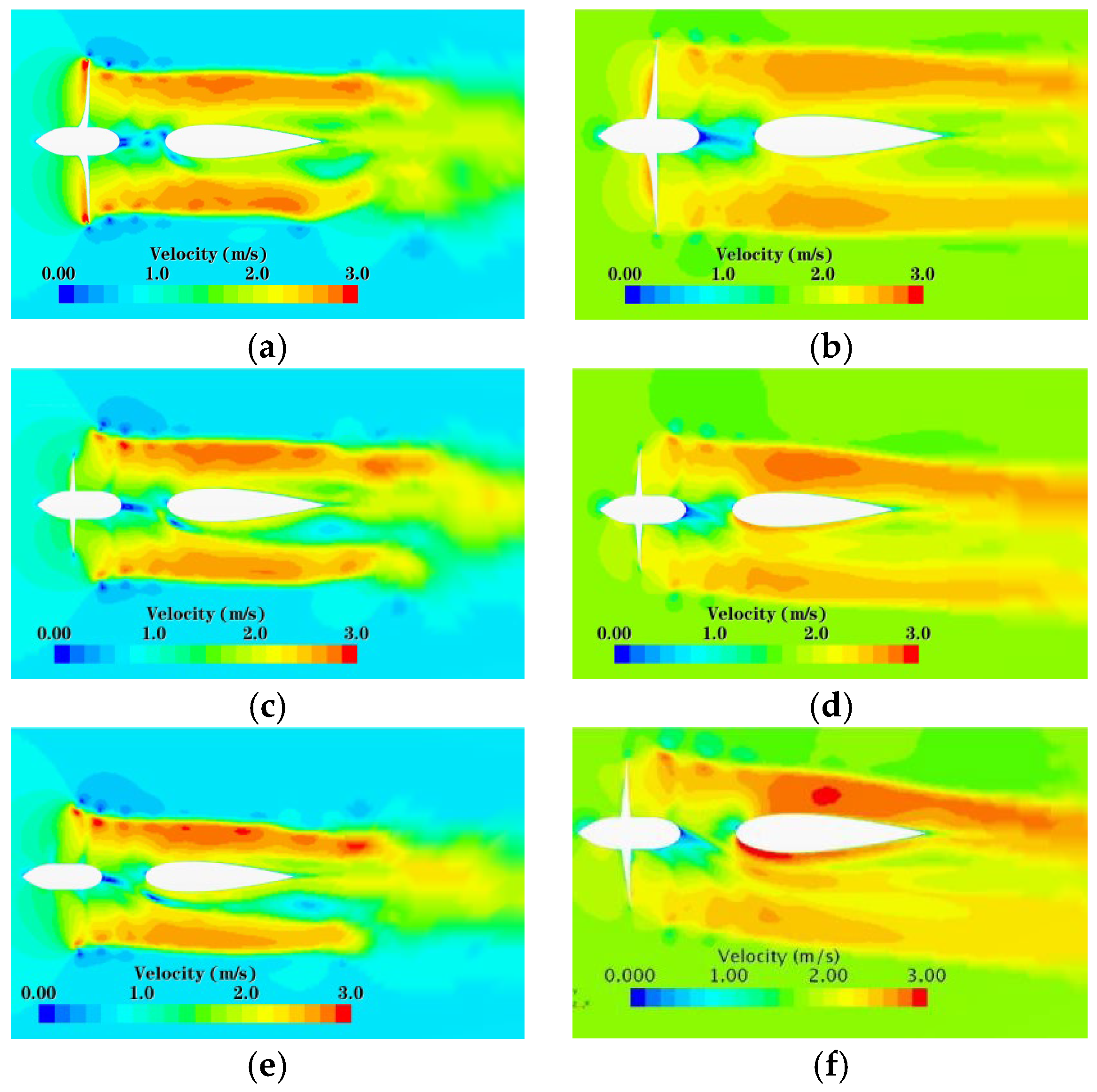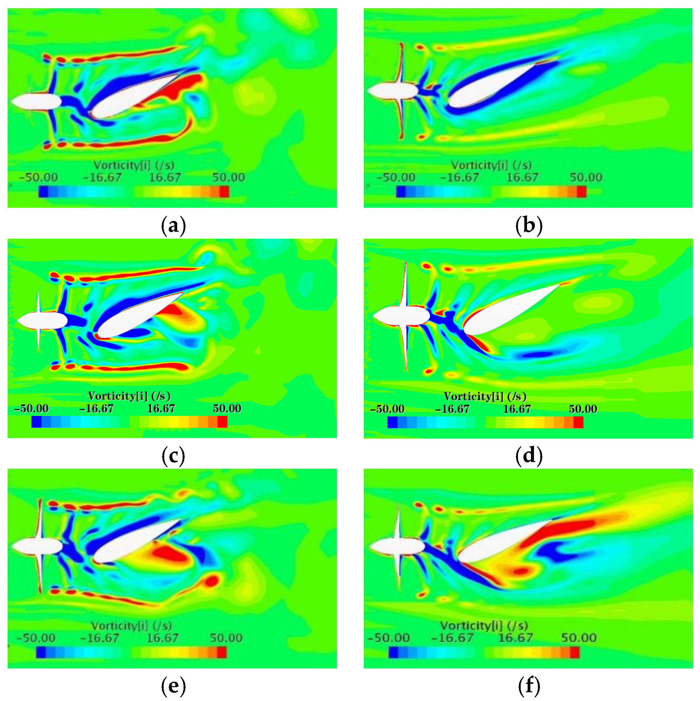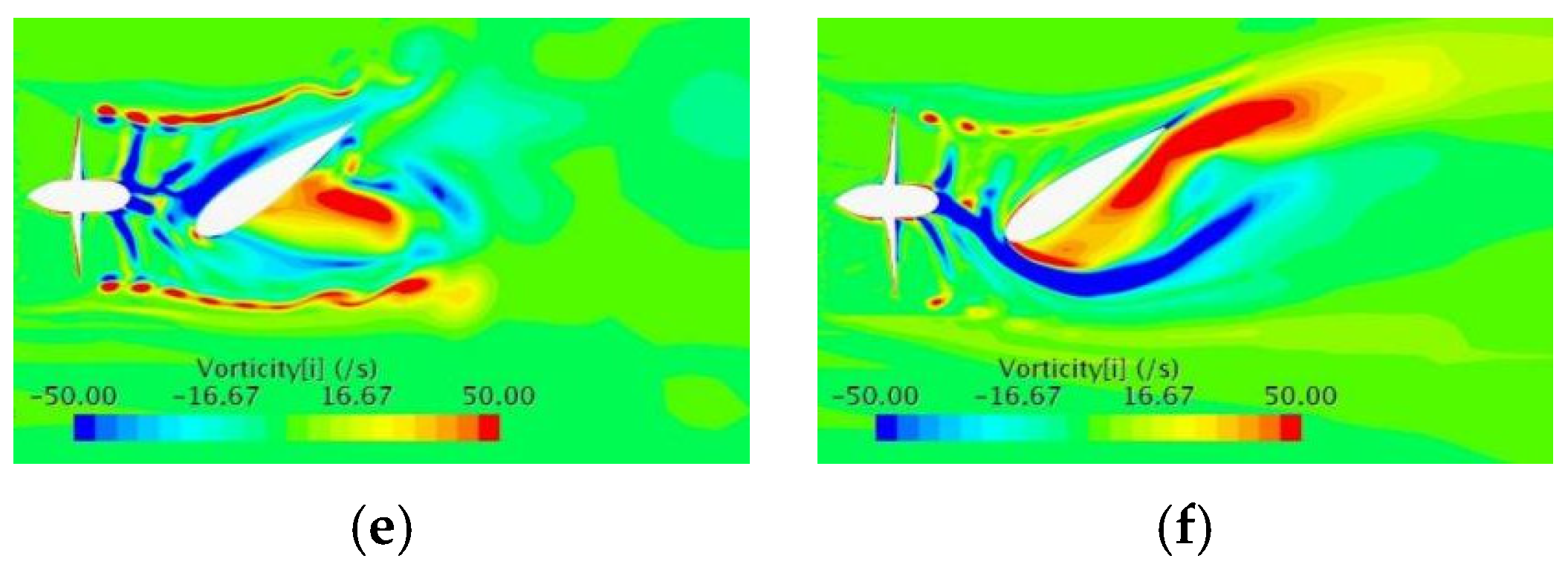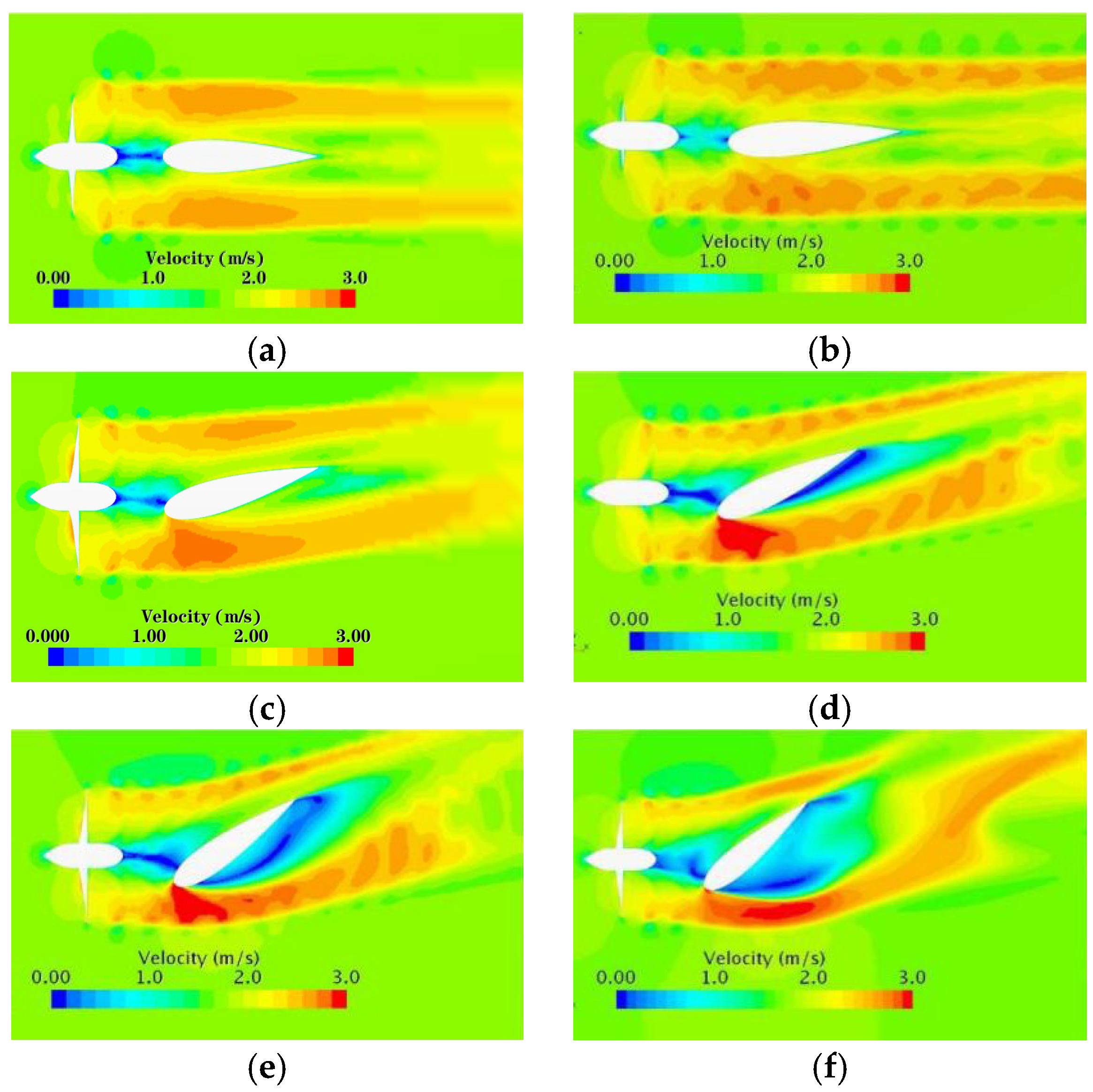 16]. Zhang conducted a numerical analysis of the wake field of a duct propeller/propeller under small-angle oblique flow. As the oblique flow angle increases, the wake field exhibits a more pronounced influence from the angle of attack [
