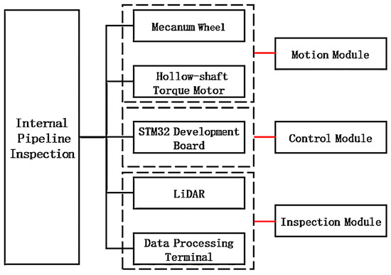 To guarantee the stability of the inspection device and the reliability of the acquired data, the internal subsea pipeline inspection apparatus presented in this paper is divided into three modules: the locomotion module, the control system, and the detection module. The locomotion structure employs a combination of a hollow-shaft torque motor and Mecanum wheels. The control system utilizes an STM32 development board as its platform, implementing PID control algorithms to enable the autonomous movement of the inspection device. The detection module consists of a LiDAR sensor for point cloud data acquisition. The acquired point cloud data are transmitted to a data processing terminal for 3D reconstruction. The overall design scheme is illustrated in Figure 2.