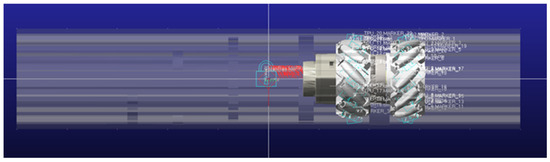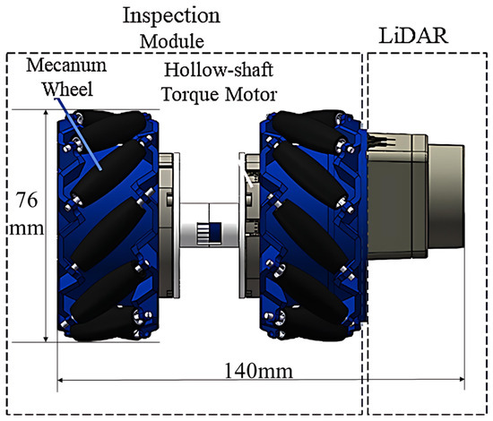 The 3D model of the inspection device is shown in Figure 3. The device is broadly divided into two main parts: the locomotion module and the LiDAR unit. The locomotion module serves as the moving platform for the device, responsible for ensuring stable movement and maintaining central alignment within the pipe. The two Mecanum wheels are connected by a linking rod. The LiDAR unit is responsible for measuring the point cloud data of the internal bore. Furthermore, the STM32 development board is housed within the central cavity of the Mecanum wheel assembly. Wiring connects the various components through the through-hole of the hollow-shaft torque motor. Considering the constraints of the actual operating space, a custom-designed 12 V power supply is employed. This flat-shaped power system is mounted, along with the development board, within the central cavity of the Mecanum wheel assembly.