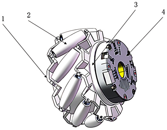 Structural diagram of the locomotion module: (1) Mecanum wheel hub; (2) Mecanum wheel roller; (3) motor sleeve; (4) hollow-shaft torque motor.