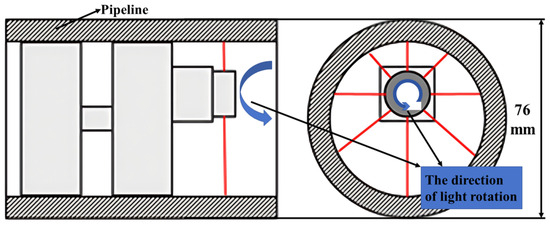 After the comprehensive evaluation of these factors, the Orbbec MS200 LiDAR was selected, which is shown in Figure 5. This LiDAR operates based on the time-of-flight (ToF) ranging principle. It has a diameter not exceeding 40 mm, a weight of only 40 g, a measurement range of 0.03 m to 12 m, and a sampling frequency of 4500 points per second. These specifications ensure that sufficient point cloud data can be collected within a short time period. During operation, the LiDAR scans the pipeline interior to collect data. The acquired point cloud data are received by a data acquisition program on the processing terminal for subsequent analysis. Since the LiDAR’s minimum measurement distance is 30 mm, it was installed with an offset (eccentric mounting), as illustrated in Figure 6, to avoid any blind spots in the measurement field.