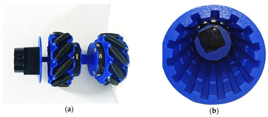 Conventional architectures for in-pipe locomotion typically employ either wheeled or linkage-based mechanisms. Wheeled systems propel themselves through motor-driven wheels engaging the pipe inner wall, offering continuous and efficient motion. Their design is relatively simple and allows for high traversal speeds; however, they exhibit poor adaptability to irregular pipe geometries and obstacles, with their traction being highly dependent on the friction between the wheels and the pipe surface. In contrast, linkage-based mechanisms, often inspired by the biomechanics of organisms such as inchworms, achieve peristaltic crawling through the alternating extension, contraction, and locking of multiple body joints. This inchworm-like, step-by-step locomotion is characterized by relatively low speeds but demonstrates exceptional terrain adaptability and obstacle-crossing capabilities, making it particularly suitable for complex pipeline environments. To overcome the limitations of traditional locomotion systems [28], a novel structure integrating a hollow-shaft torque servo motor with Mecanum wheels [29] was designed. One hollow-shaft torque motor and one Mecanum wheel constitute a single locomotion module. The device incorporates two such modules connected in series at the front and rear. The structure of the locomotion module is depicted in Figure 4.