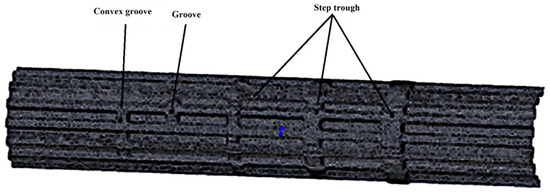 Following the completion of the internal pipeline inspection device model, a kinematic simulation analysis was conducted to verify the feasibility of the device’s movement within the pipeline and to analyze the stability of its motion. Using the ADAMS 2020 software, a pipeline internal model was established based on realistic operational conditions. The model incorporated multiple straight grooves, stepped grooves, and irregular recesses to simulate internal surface anomalies. The inspection device model was then positioned within this pipeline environment for simulation analysis. The overall assembly model is presented in Figure 7.