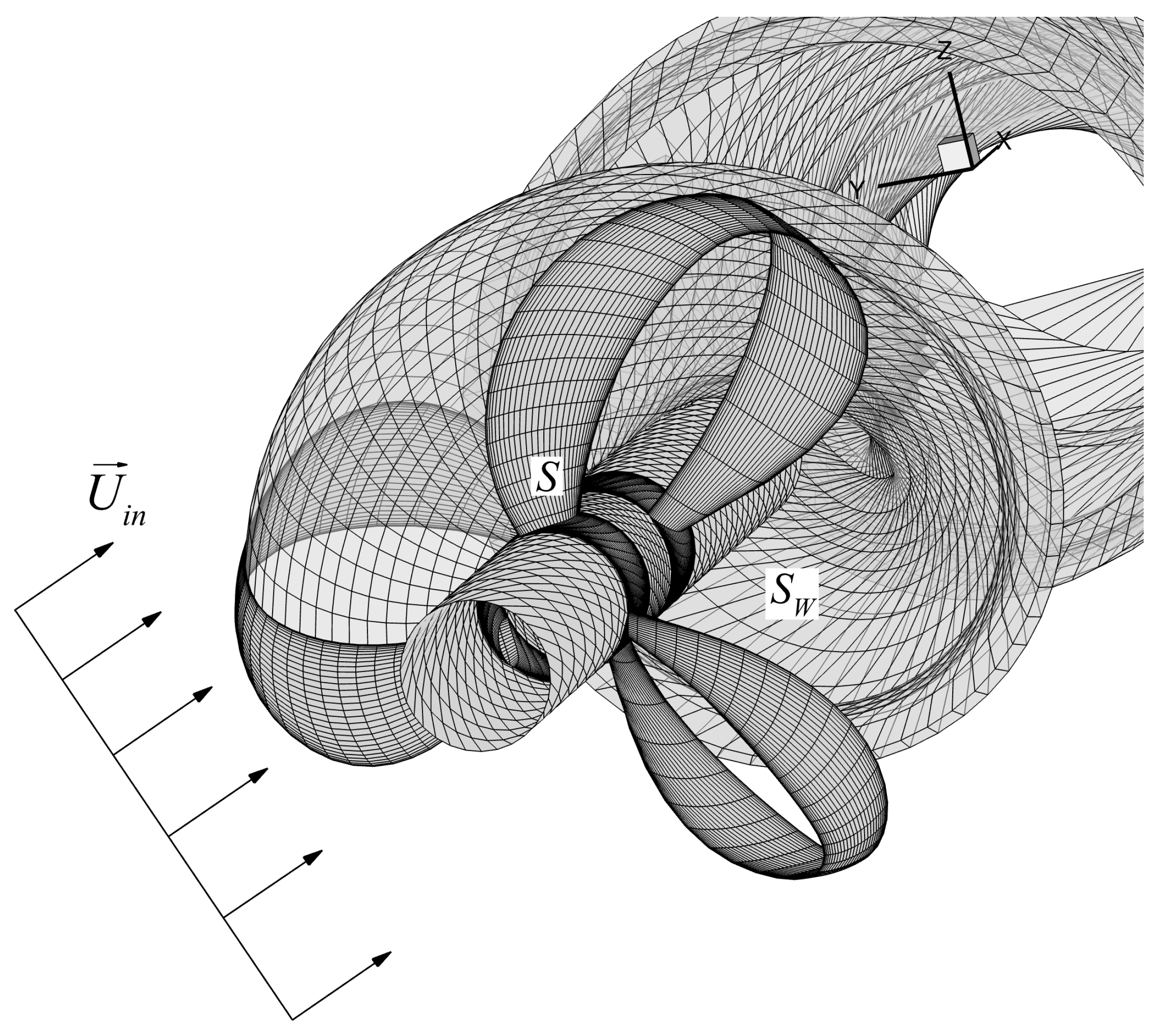 Figure 1. The toroidal propeller and wake panels subject to the general effective inflow U i n ; for clarity, the wake is shown only for the key-blade.