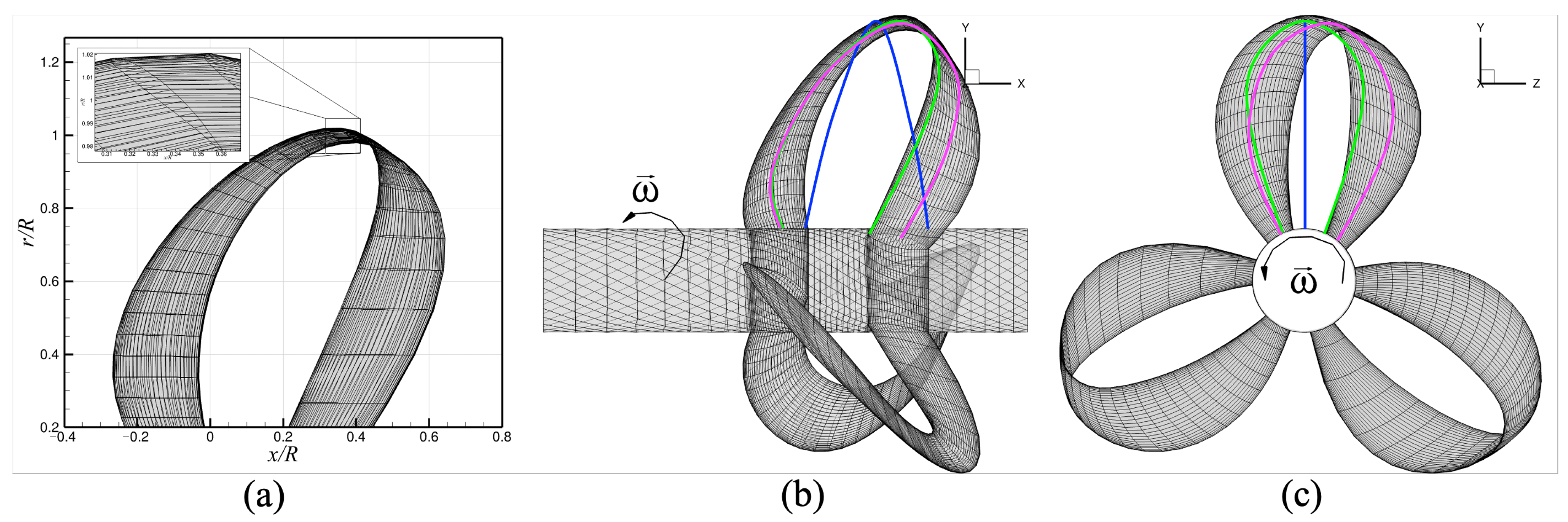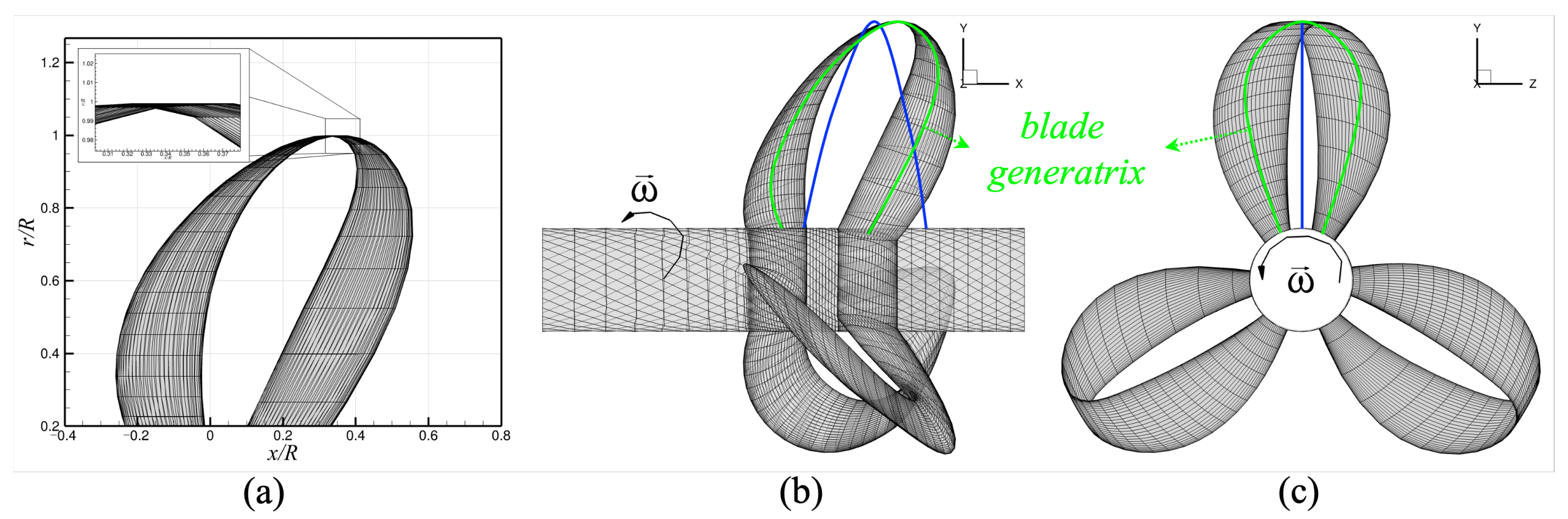 Figure 4. The toroidal propeller geometry and its blade reference line modeled by the hydrodynamic BEM. The blade reference line was generated based on Equation (12). The subfigures show the following: (a) a close-up view of the blade tip, and (b) the propeller viewed from the side (x-y plane) and (c) from the front (y-z plane).