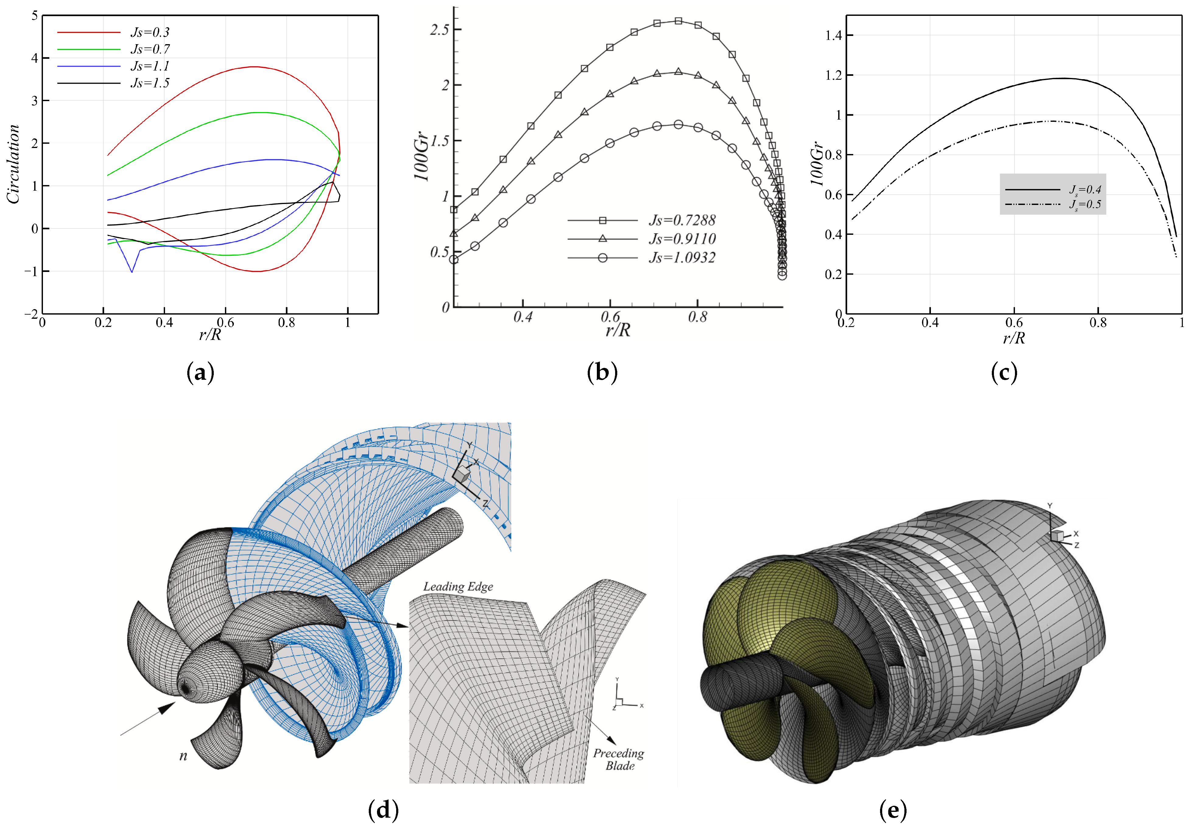 Figure 16. Comparison of the circulation distributions at the indicated advance ratios for (a) the model toroidal propeller, (b) a tip-loaded propeller, and (c) a rounded-tip open propeller. The corresponding geometries modeled by the BEM are shown in (d,e), respectively. Subfigures (b,d) were adapted from Kim and Kinnas (2021) [16], while (c,e) were adapted from Kim and Kinnas (2023) [17] for comparison.