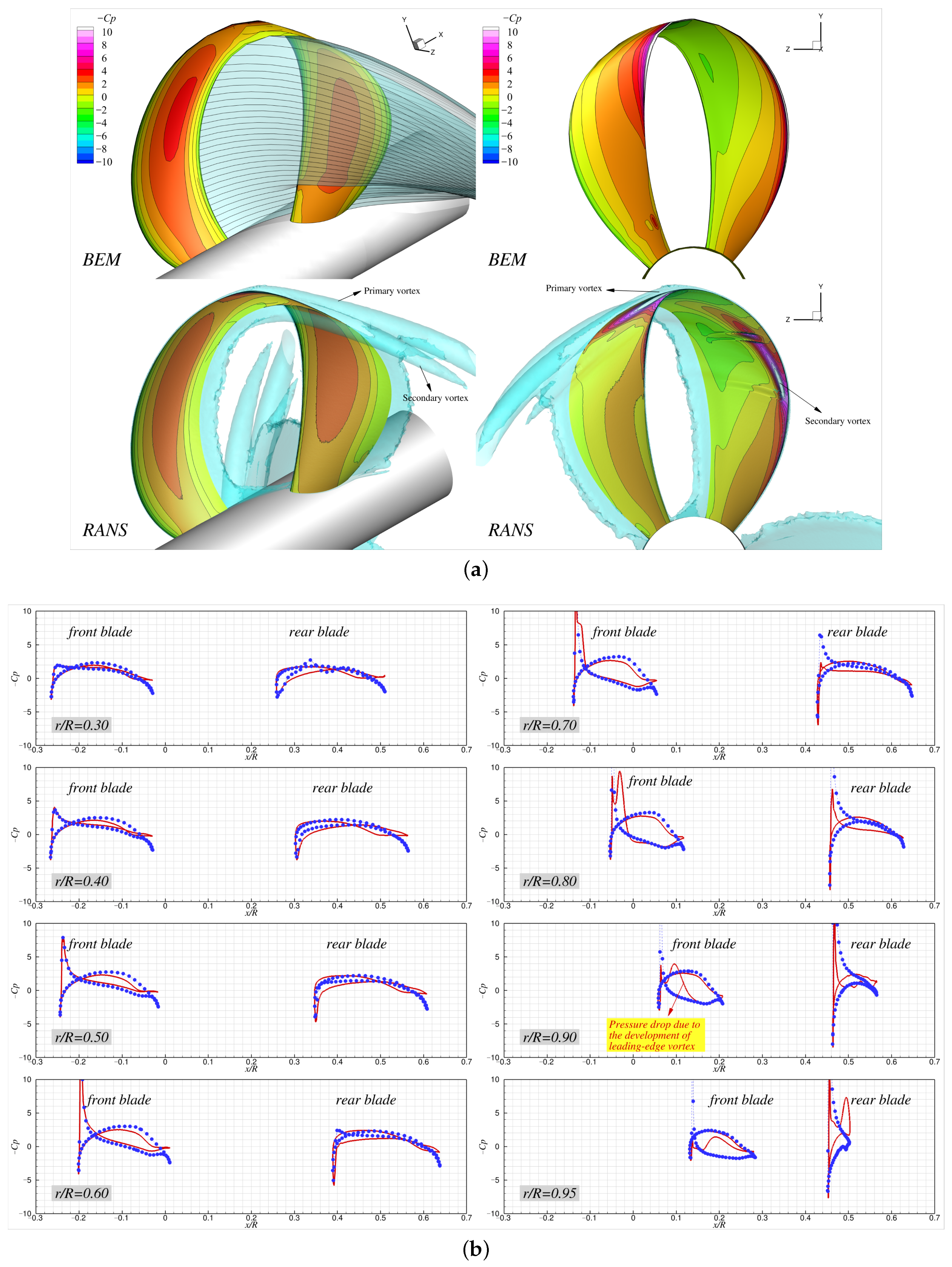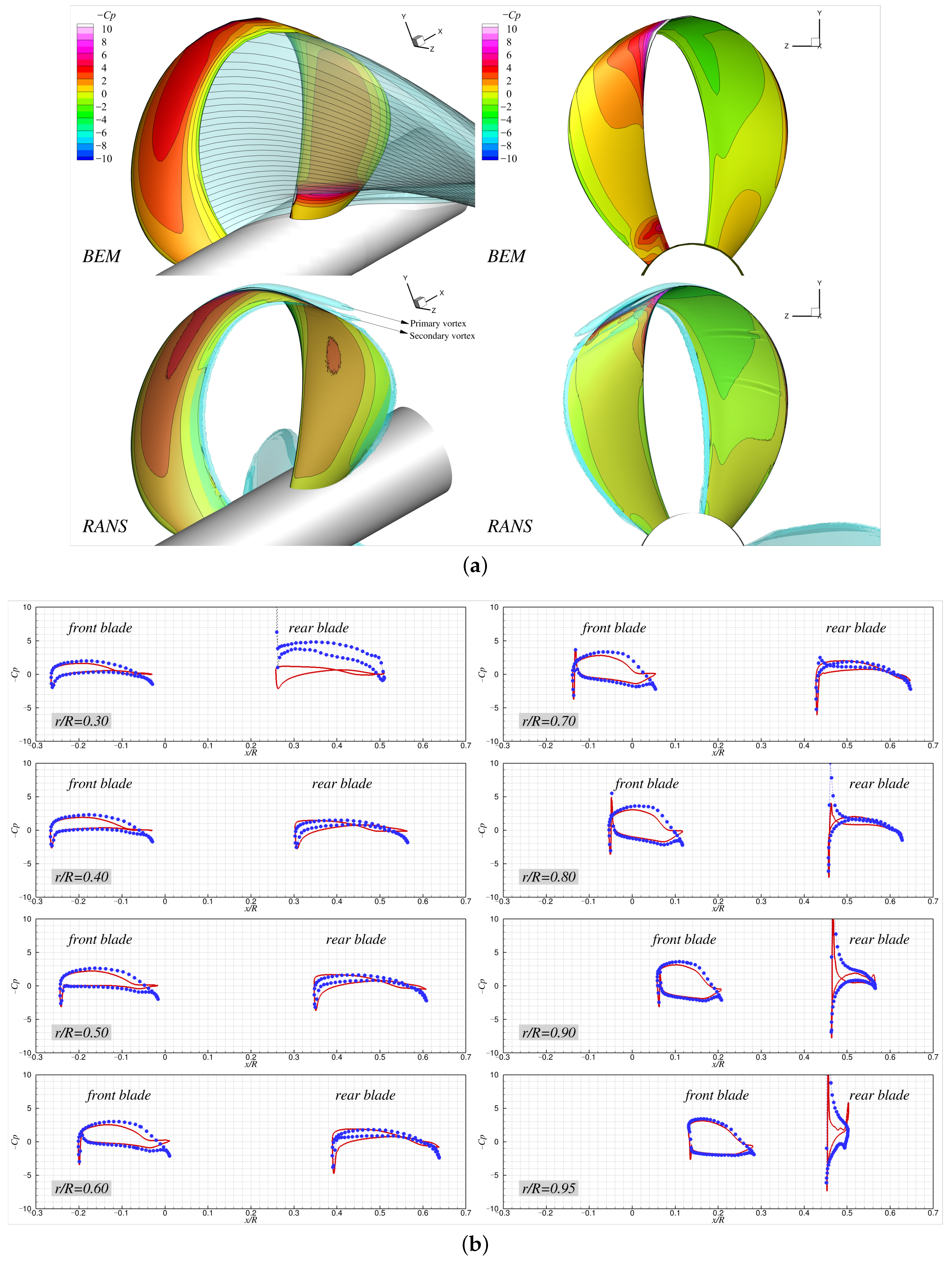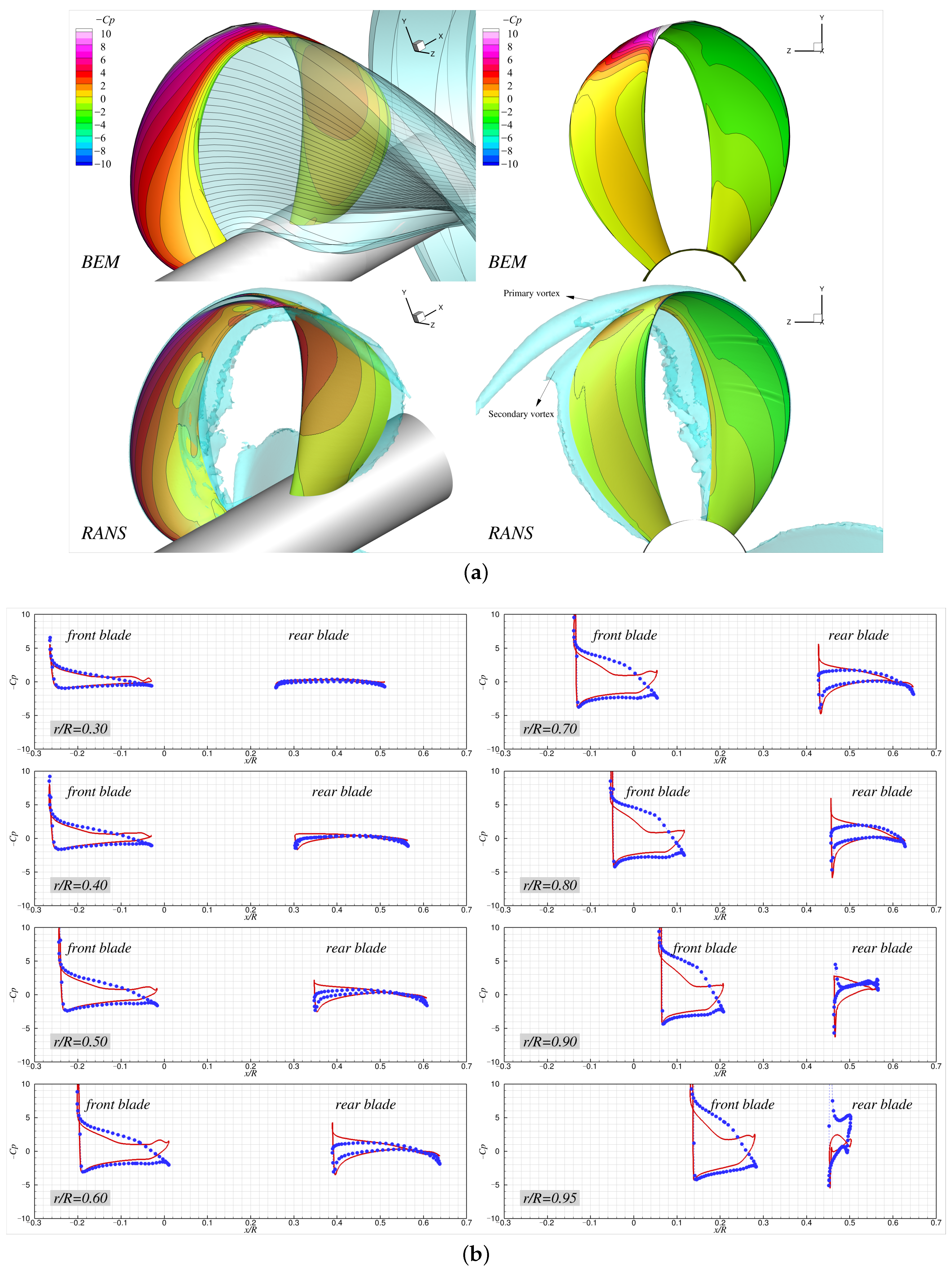 Figure 19. Comparison of the surface pressure distributions ( C p ) on the blade between the BEM and RANS results in (a) 3D with the fully aligned BEM wake and the iso-surface of vorticity magnitude of 100 [s−1] in perspective view and in (b) 2D plots at several radial stations, where the BEM results are blue scatters and the RANS results are red solid lines. J s = 1.1 .