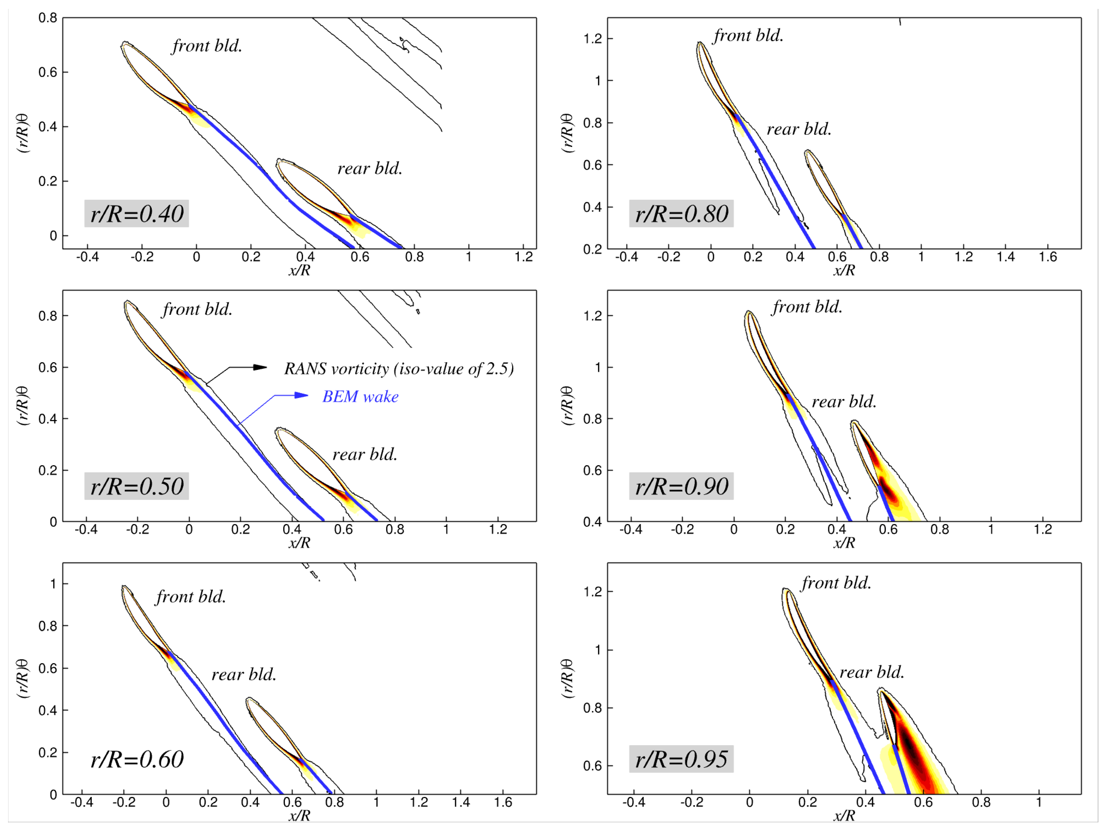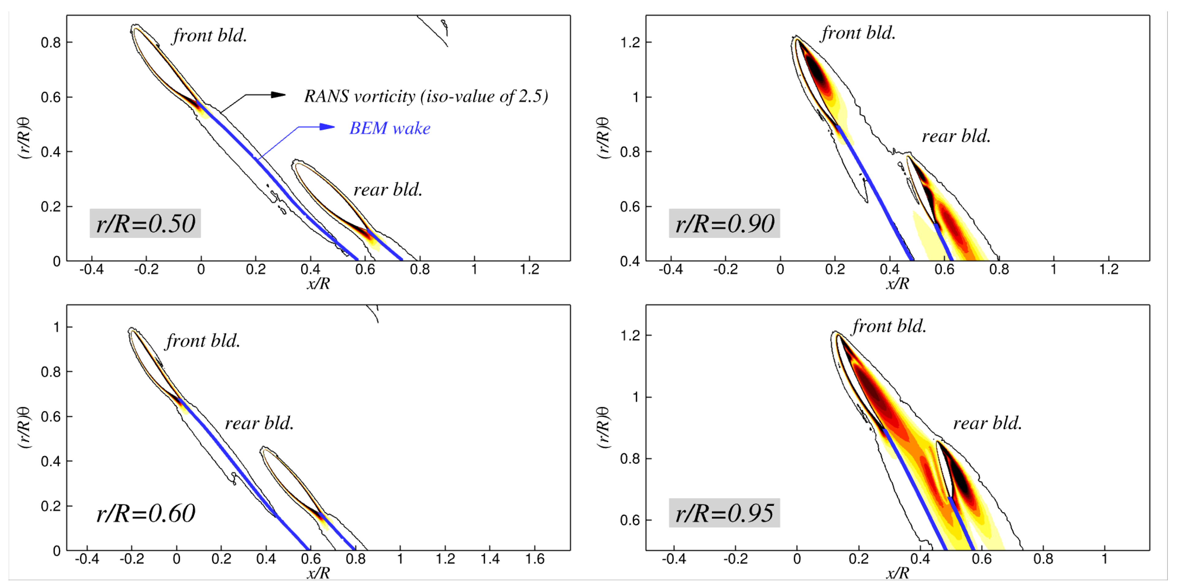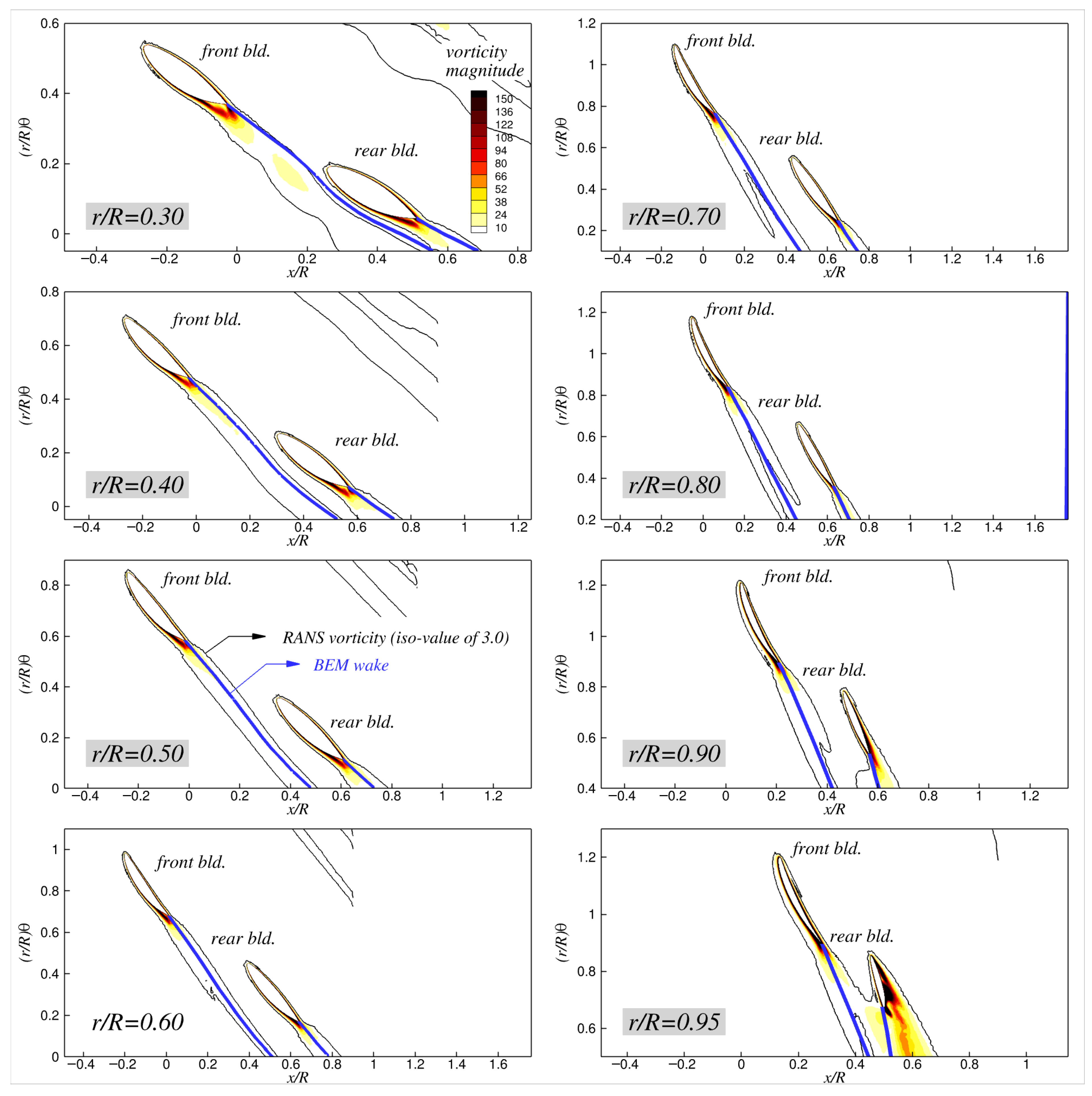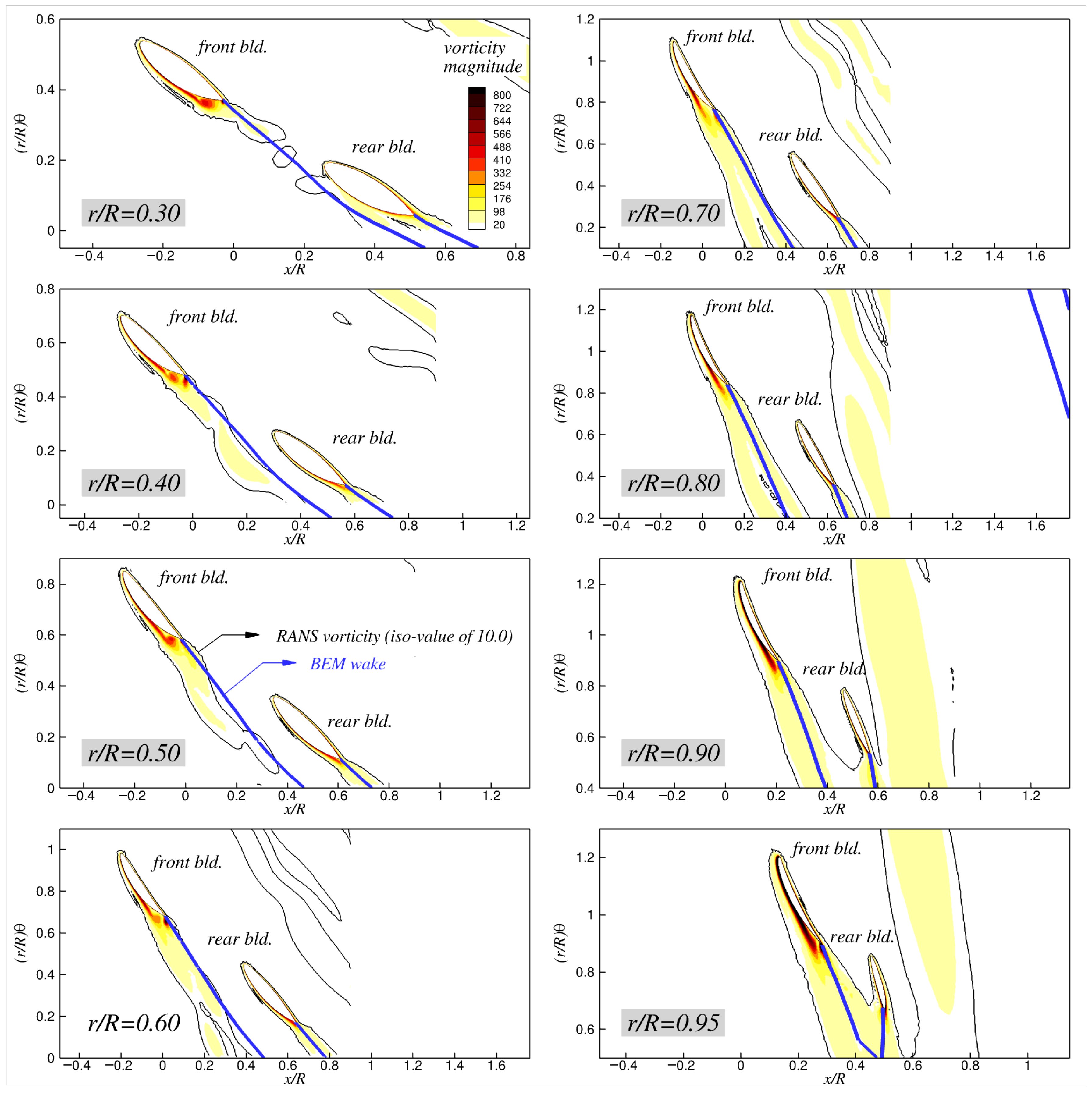 Figure 23. Comparison of the BEM trailing wake and the RANS-simulated shed vortices on the x- r θ plane at several radial stations. The BEM wakes are shown as blue solid lines, while the RANS vortices are represented by contour plots, with black solid lines indicating the specified iso-value of the vorticity magnitude. J s = 1.1 .