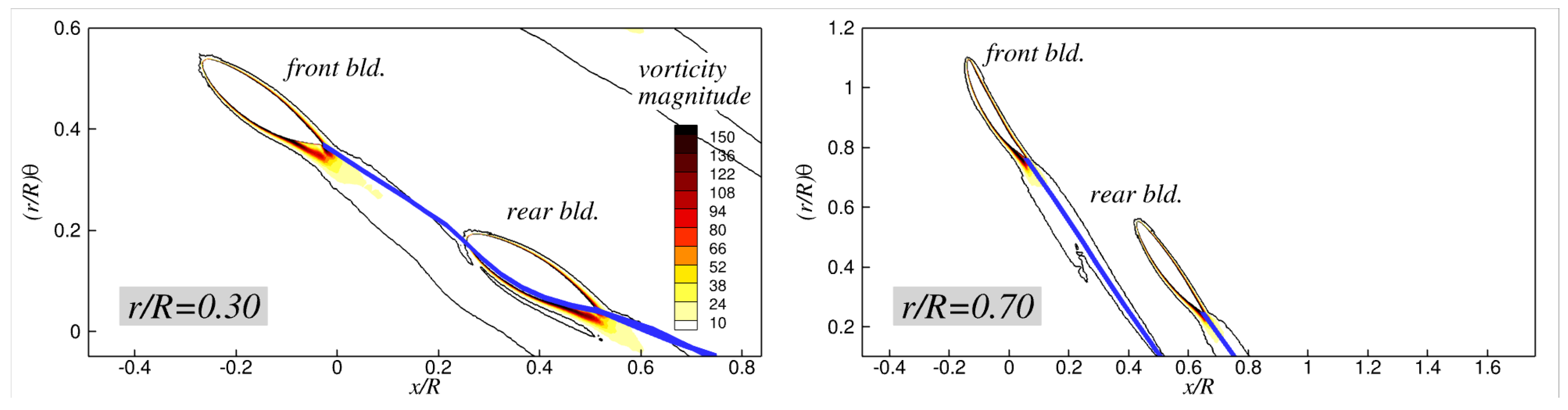 Figure 22. Comparison of the BEM trailing wake and the RANS-simulated shed vortices on the x- r θ plane at several radial stations. The BEM wakes are shown as blue solid lines, while the RANS vortices are represented by contour plots with black solid lines indicating the specified iso-value of the vorticity magnitude. J s = 0.7 .