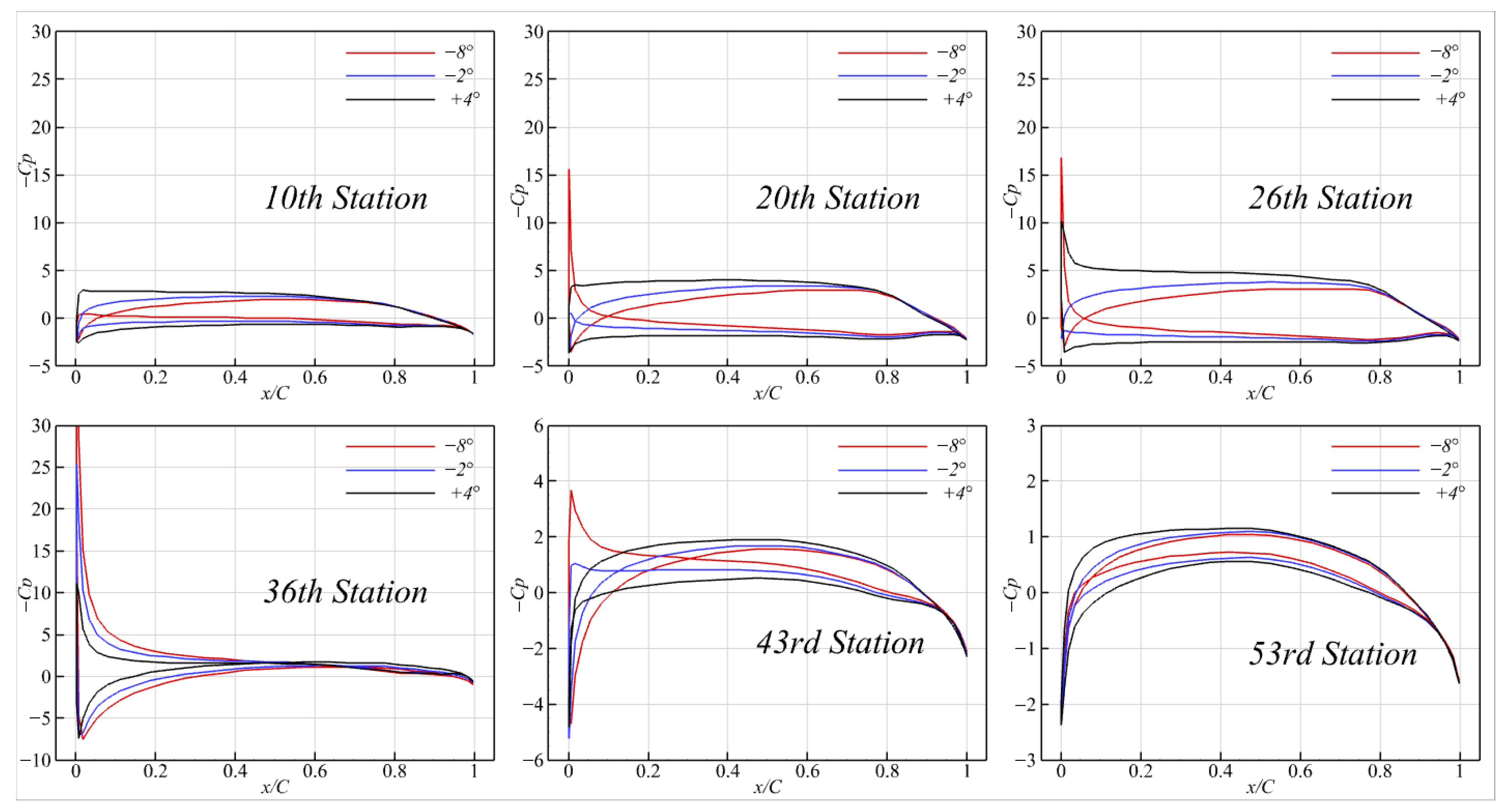 Figure 27. Comparison of the pressure distributions predicted by BEM for the several pitch adjustments at the stations that are denoted in Figure 25c.