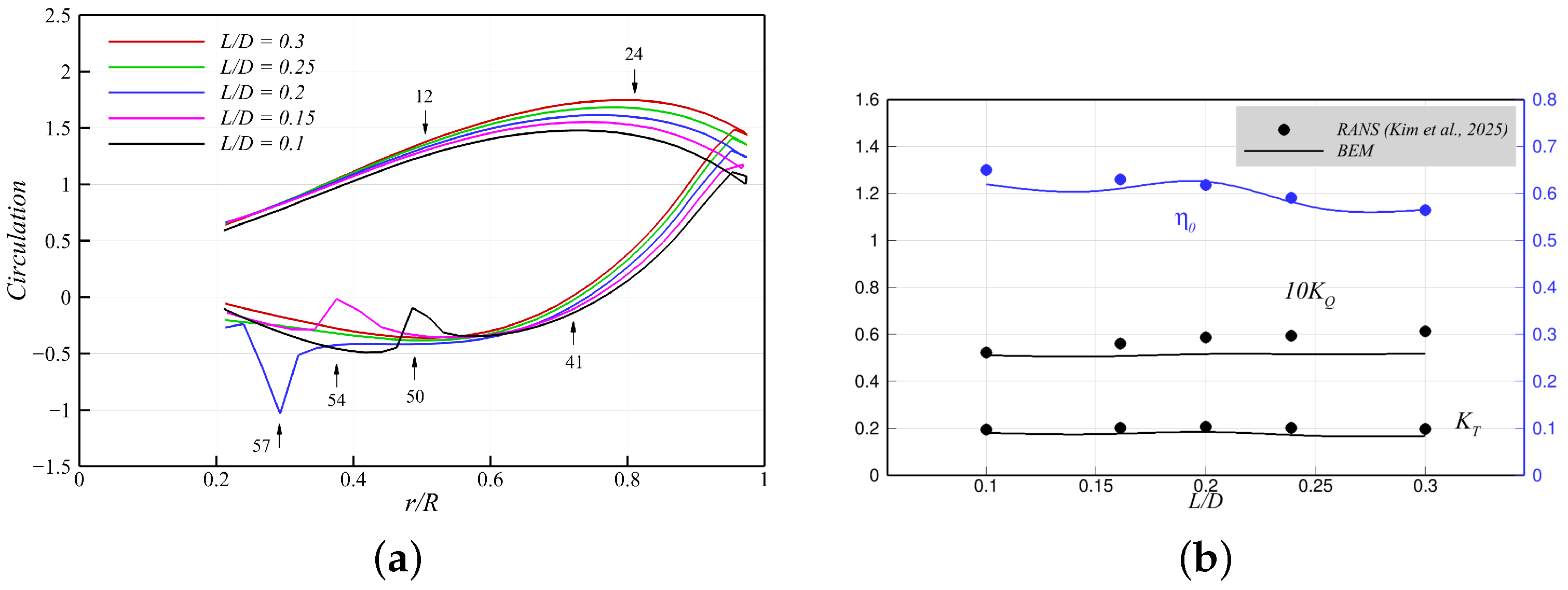 Figure 30. Comparison of the (a) circulation distributions for varying axial distances and the (b) corresponding open water performance predictions from BEM and RANS [6]. J s = 1.1 .