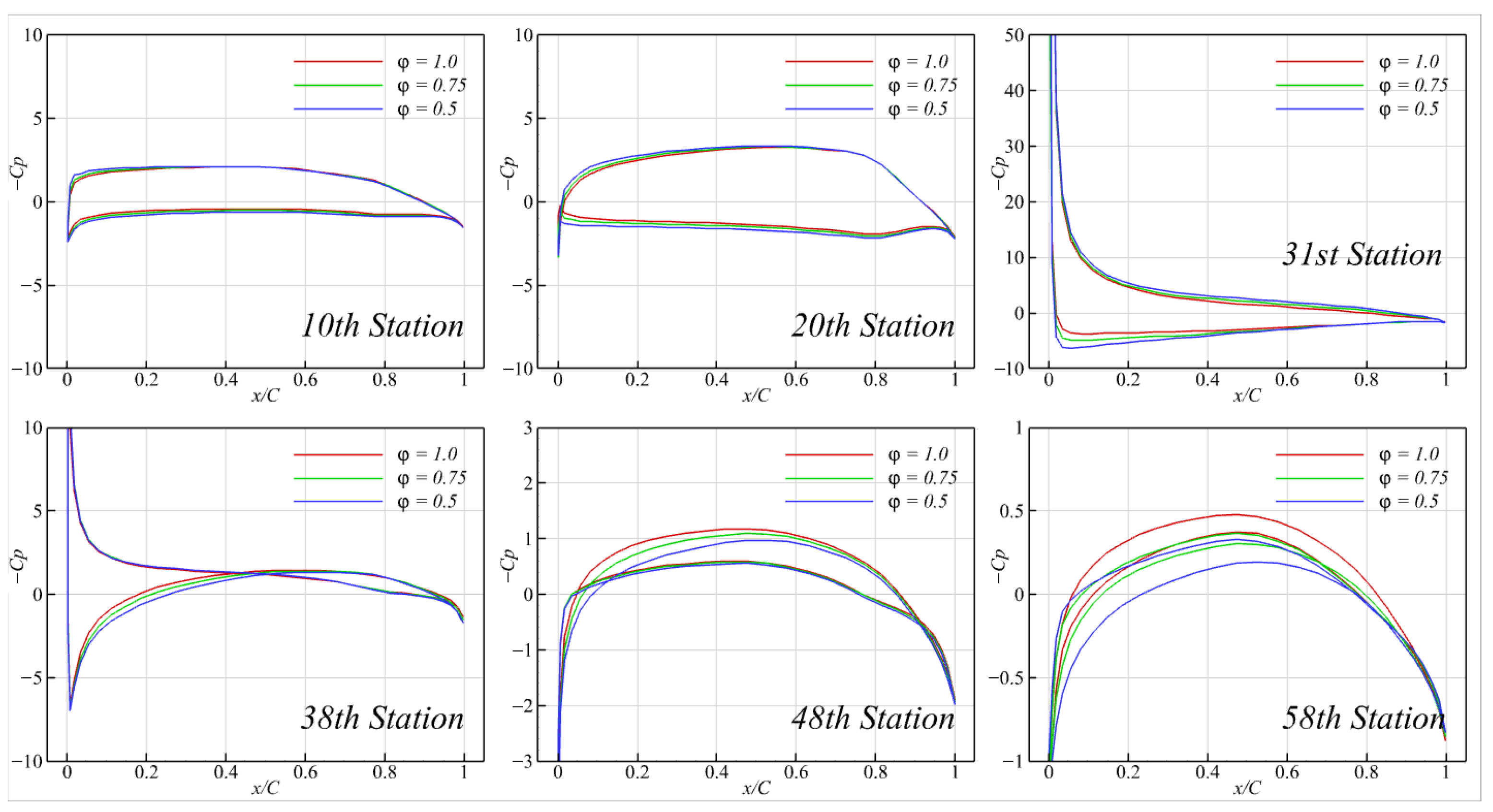 Lastly, the proposed method was evaluated for different lateral angles, i.e., φ = 0.5 , 0.75 , and 1.0 , at an advance ratio of J s = 0.7 , as shown in Figure 31, where φ = 1.0 corresponds to the baseline geometry. The cases where φ = 0.75 and 0.5 represent the configurations where the lateral angle of the baseline geometry was uniformly reduced to 75% and 50% of its original value, respectively, along the entire span.