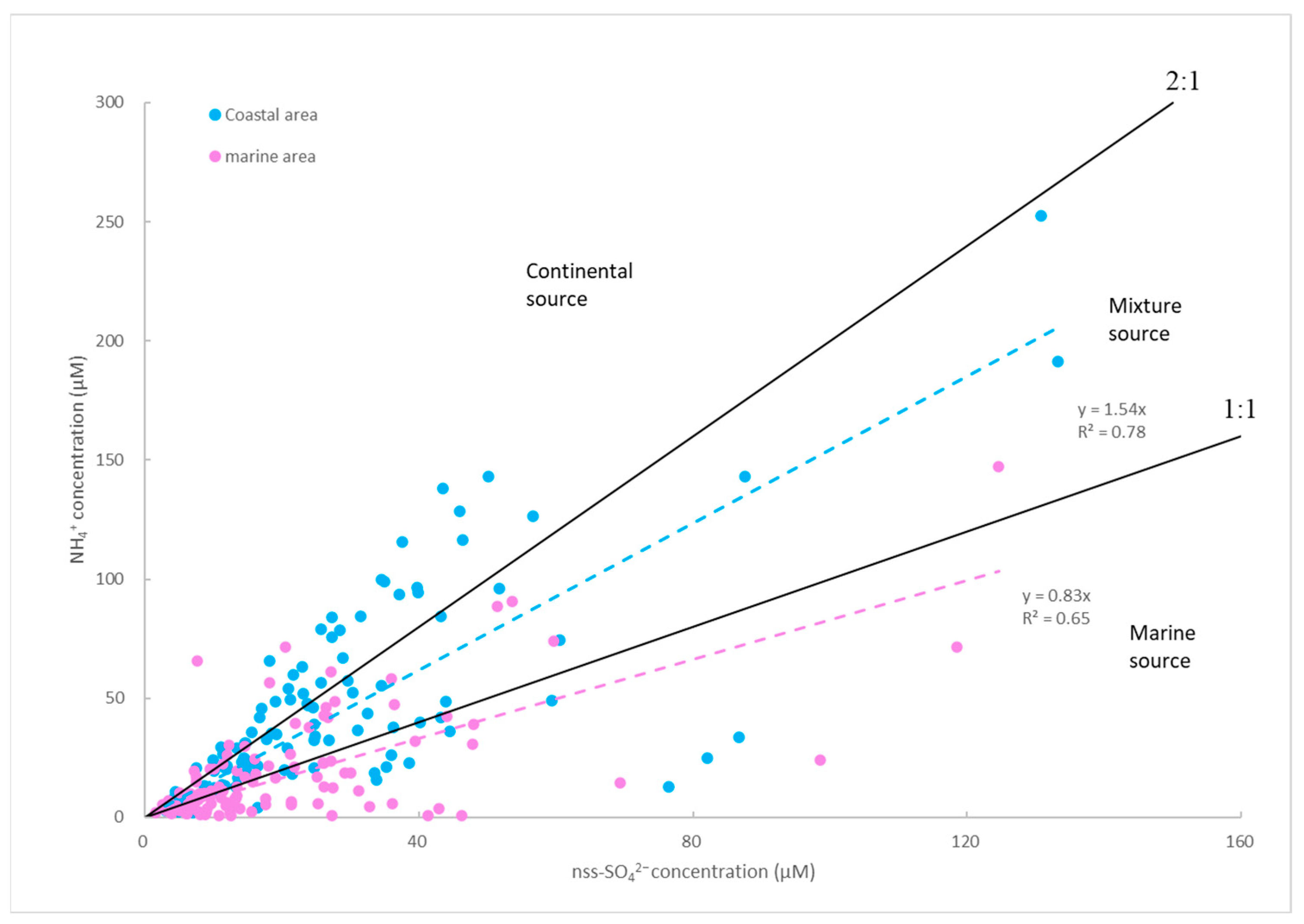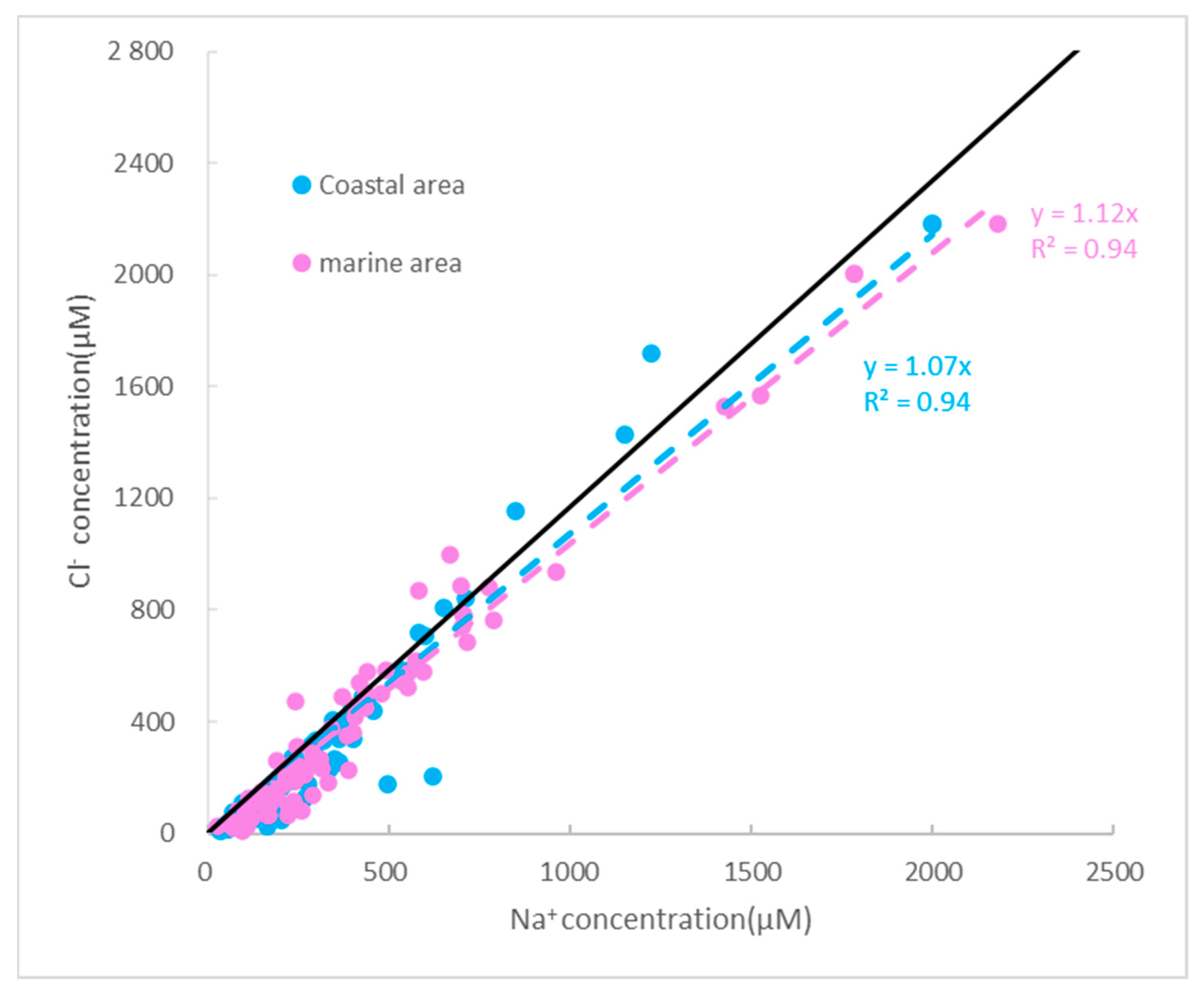 − in the marine area are higher (326 ± 322 μM and 345 ± 499 μM, respectively) than those in the coastal area (245 ± 133 μM and 255 ± 153 μM, respectively) because the marine area is surrounded by seas, primarily encompassing marine sources [