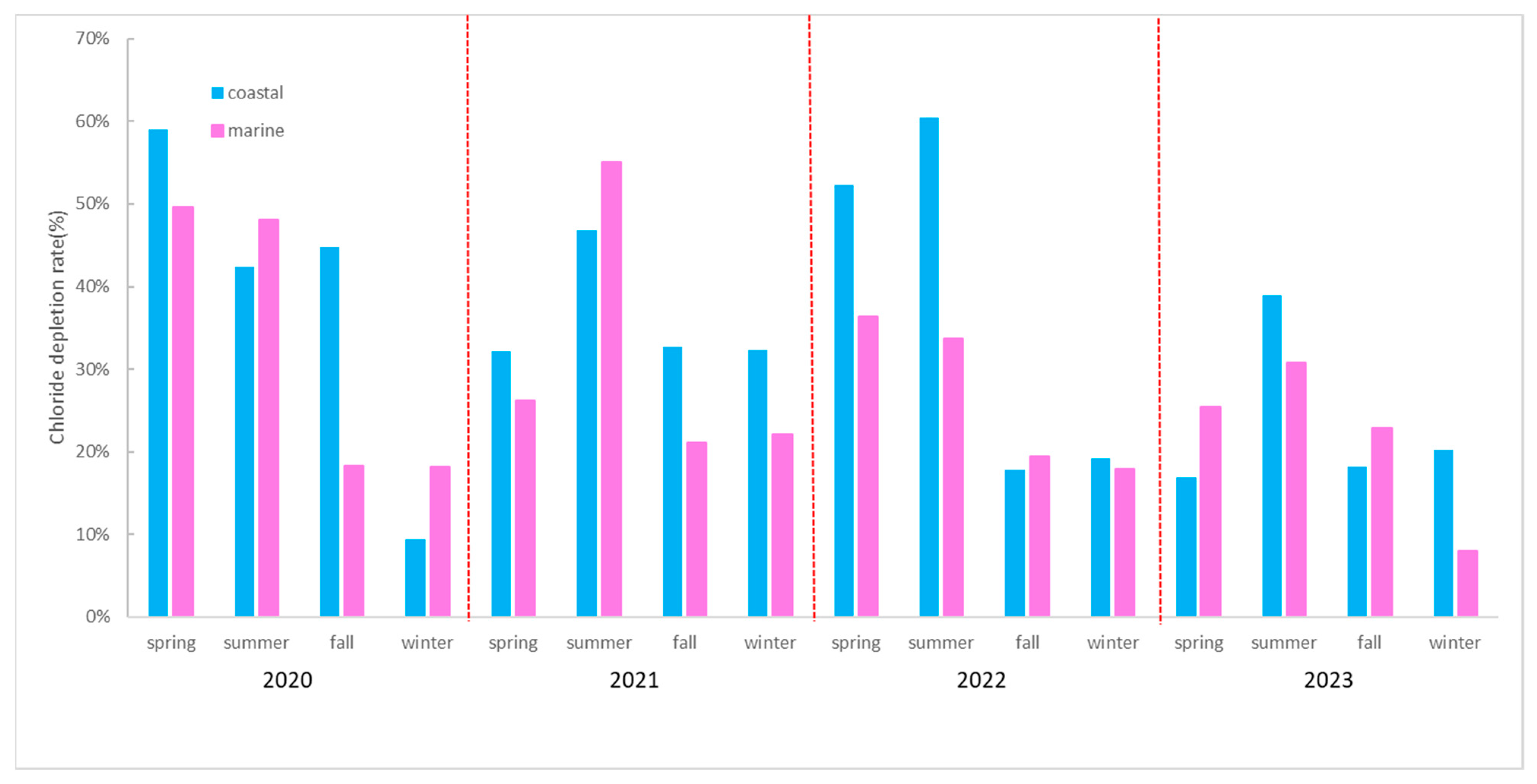 In this study, rainwater samples were collected from the selected coastal and marine areas for concentration, correlation, and source analyses of TDN, DIN, DON, and major ions. In terms of major ion concentrations, the Cl−/Na+ ratio in both the coastal (1.07) and marine (1.12) areas was lower than that in the ocean (1.17), indicating that reactions between anthropogenic pollutant emissions such as SO42− and NO3− and sea salt ions (NaCl) led to chloride depletion reactions. The yearly chloride depletion rate decreased after the COVID-19 lockdown period in 2020.