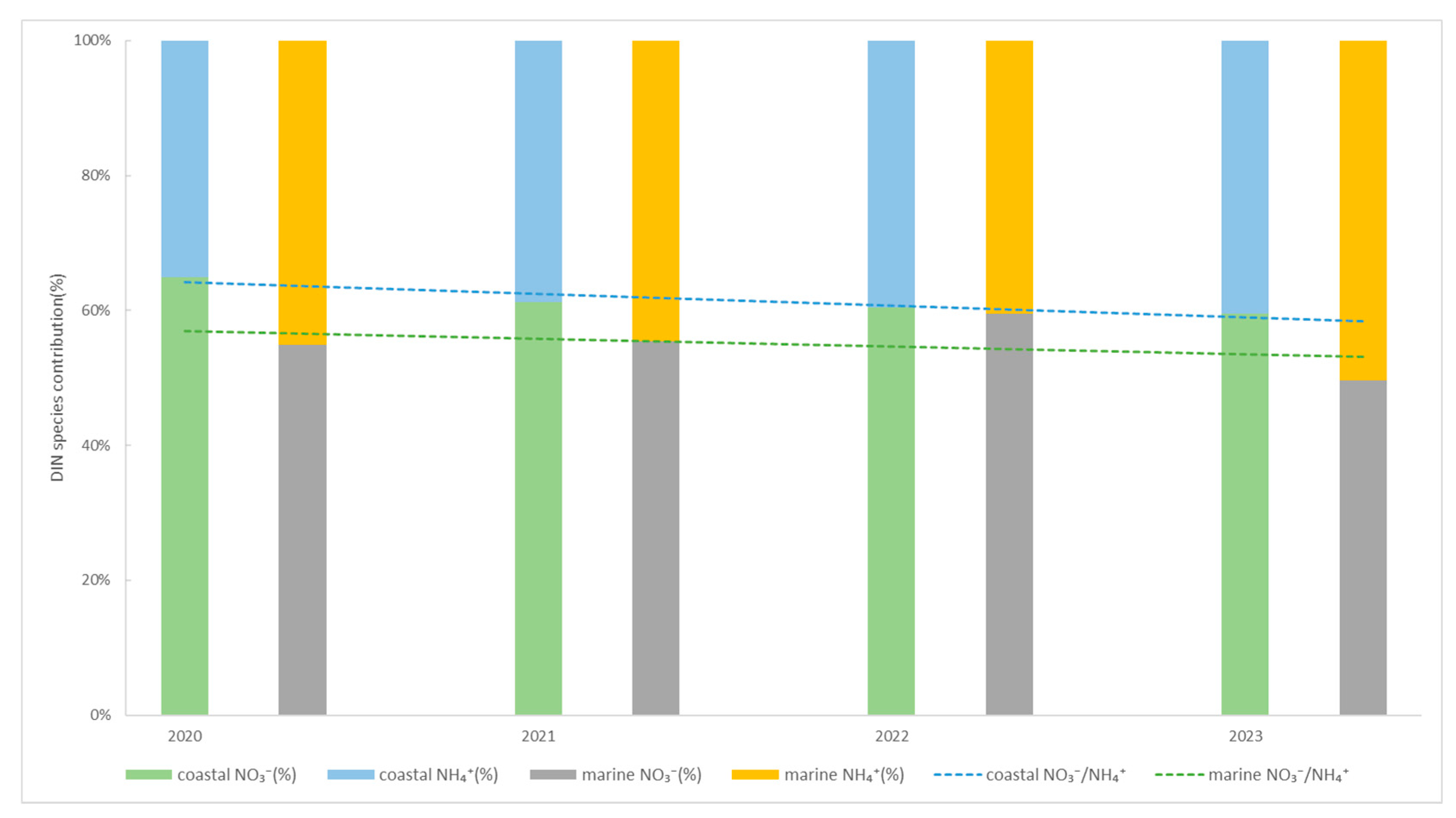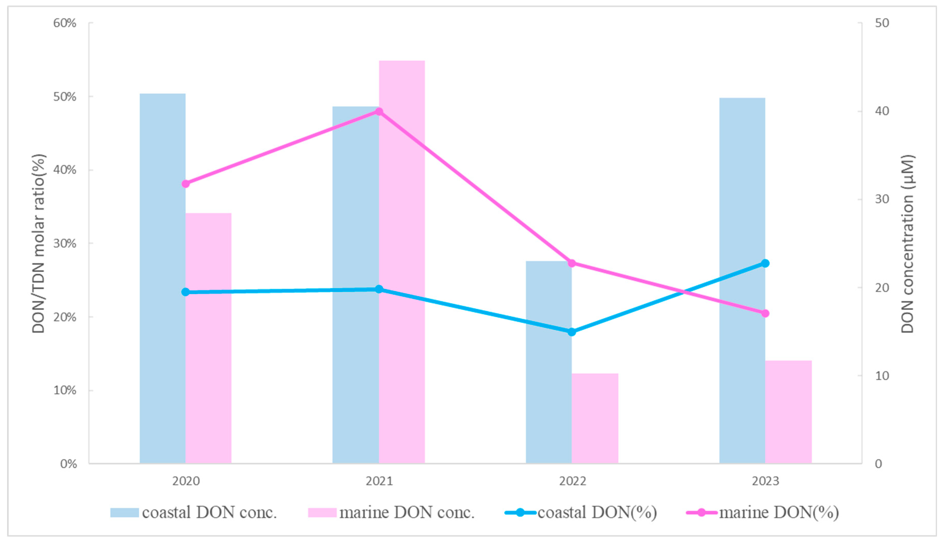 14]. The average DON concentration in the coastal area was higher than that in the marine area, with higher values observed in autumn in the coastal area and in winter and spring in the marine area. The DON/TDN ratio was 24% in the coastal area and 32% in the marine area. At the yearly scale, DON/TDN decreased by 40% in the coastal area and by 78% in the marine area in 2022, indicating complex sources of DON in the coastal area and the major contribution of anthropogenic sources in the marine area.