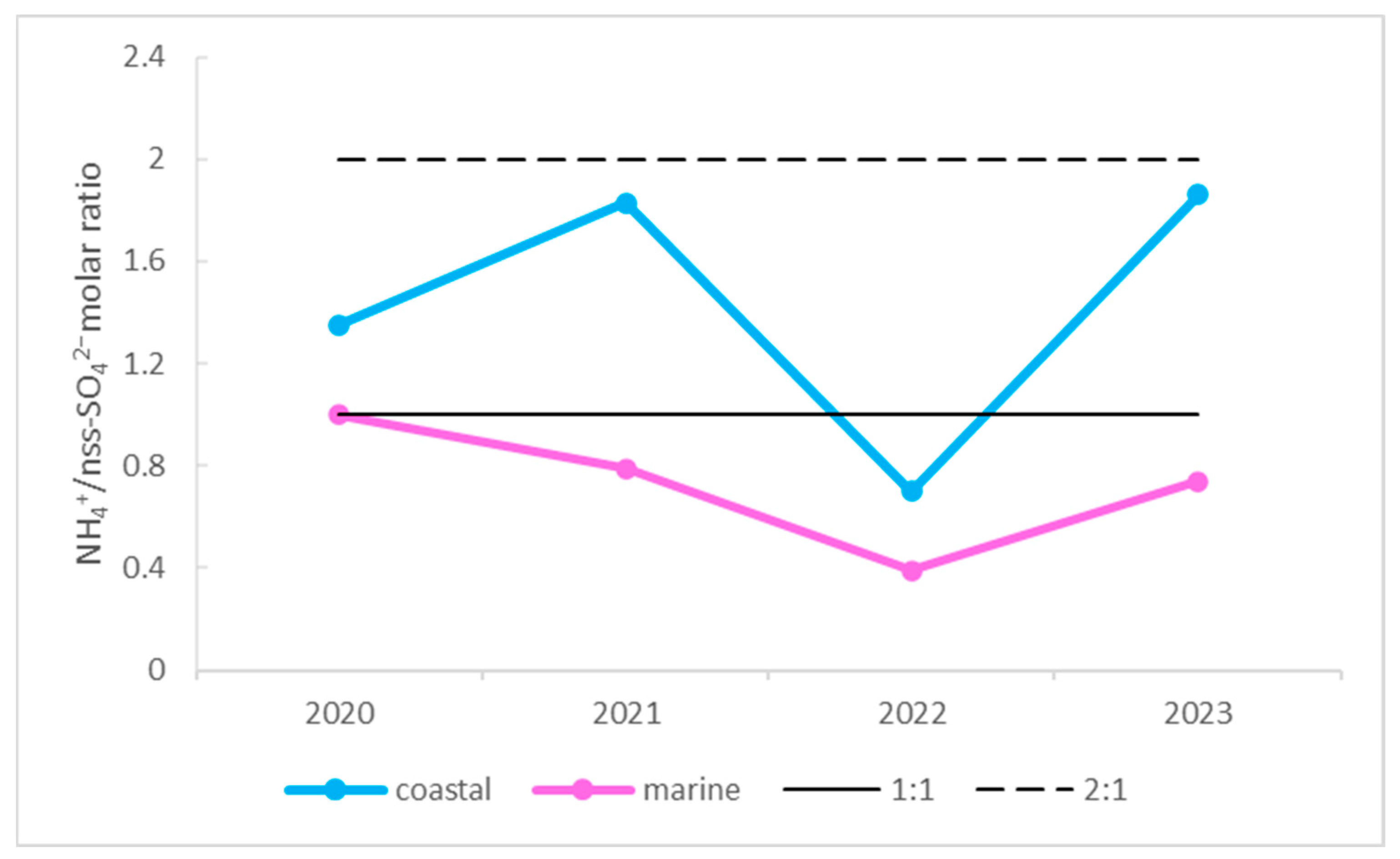 With respect to the DIN (NO3− and NH4+) concentrations and seasonal analysis, higher values were observed in spring and winter because of the influence of the northeast monsoon (continental air masses), whereas lower values were observed in summer because of the southwest monsoon (marine air masses). The NH4+/nss-SO42− ratio analysis indicated values between 1 and 2 in the coastal area, reflecting mixed sources of air masses (land and ocean), whereas the values were less than 1 in the marine area because of marine-influenced air masses and relatively minor anthropogenic impacts. In terms of yearly changes, the NH4+/nss-SO42− ratio in both study areas decreased during the lockdown period because of reduced anthropogenic activities, resulting in higher O3 concentrations and RH levels in 2022.