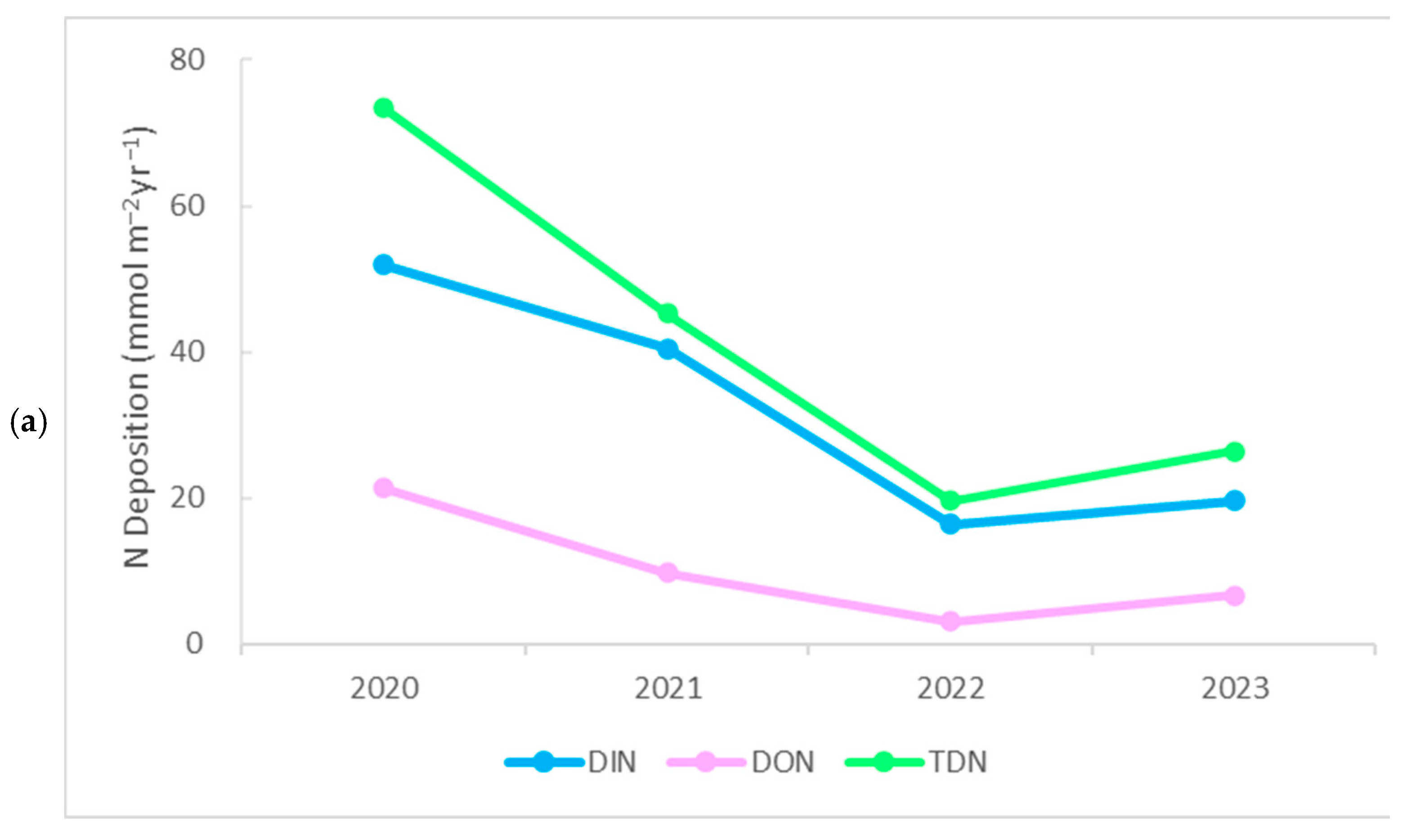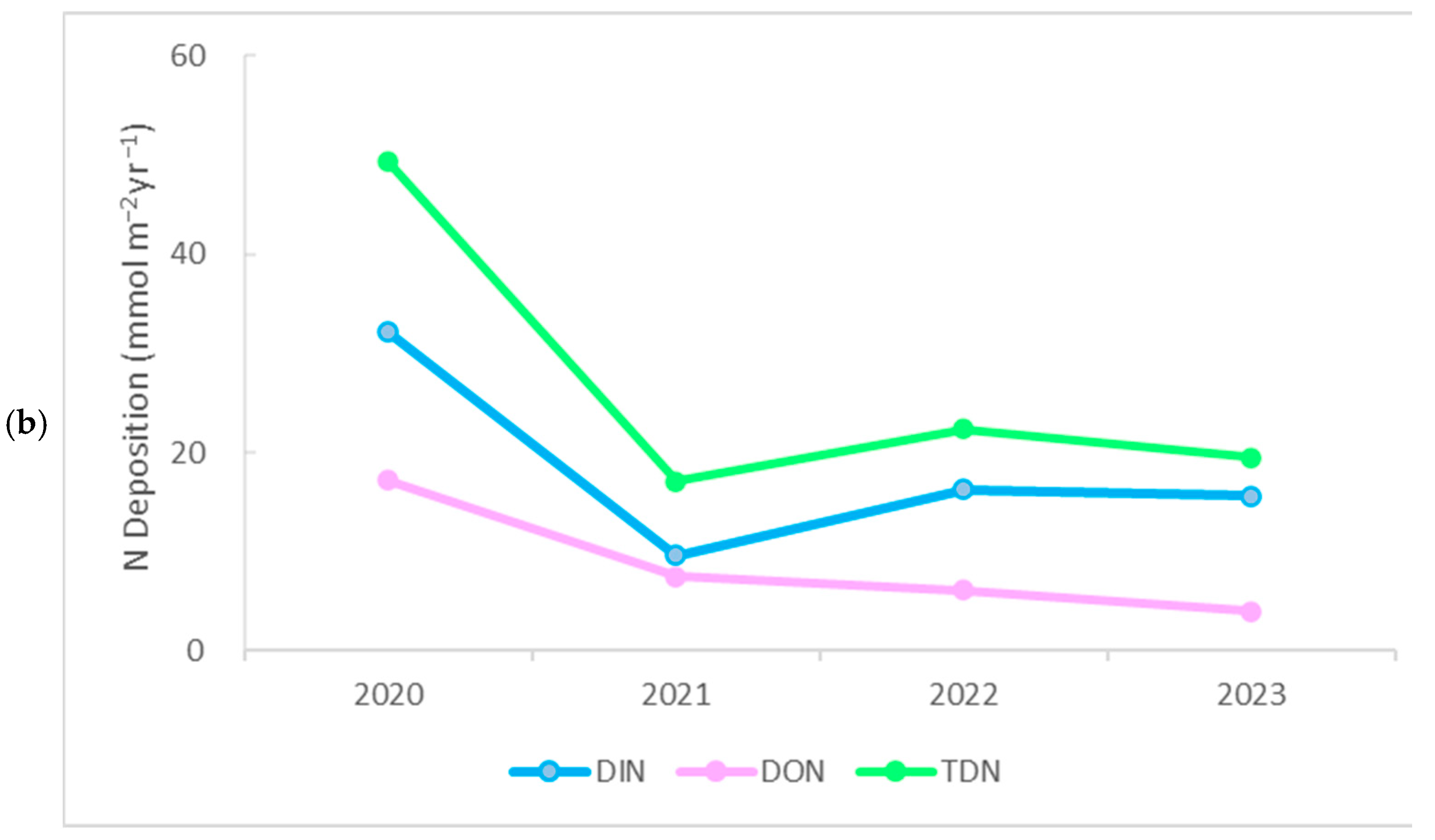 41]. Previous studies have reported significant reductions in atmospheric nitrogen emissions during the COVID-19 lockdowns, such as a 9.6% decrease in total (dry + wet) nitrogen deposition in Danjiangkou in 2020 compared with 2019 due to China’s strict containment measures [