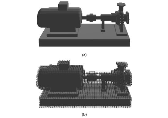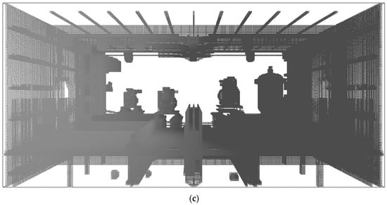 Ship CAD software can export ship models into STL format files, which contain triangular mesh data representing the contours of equipment and structures within the pipe routing space. The pipe interface configurations are derived from equipment interface specifications and the spatial coordinates of pipe penetrations across compartment boundaries. The envelope bounding box, which serves as the pipe routing space, can be constructed according to the contours of equipment, compartment structures, and pipe nozzle locations. Discretizing the bounding box into grids facilitates the implementation of routing environments and algorithms. In previous studies, rectangular cuboids were commonly employed to approximate original ship equipment models, which resulted in insufficient accuracy and labor-intensive modeling processes. This study proposes an approach that marks grids intersected by the triangular mesh contours of equipment and hull structures from STL file as obstacles, enabling efficient collision detection in subsequent pipe routing algorithms. Figure 1a,b illustrates the contour of an equipment before and after grid extraction, respectively, while Figure 1c shows the grid contours of all structures and equipment within the layout space.