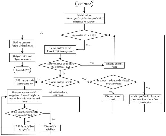 The pseudocode of the MOA* is presented as Algorithm 1, and the flow chart of the MOA* is depicted in Figure 2.